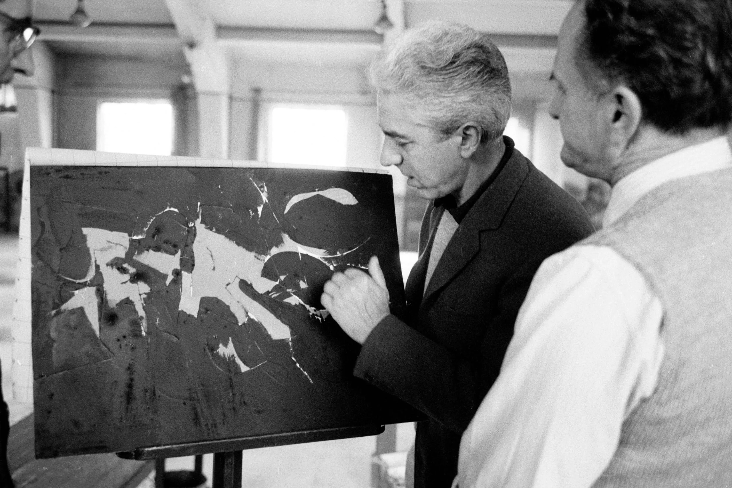 Black and white photograph of two men closely examining an abstract painting on an easel in a large studio, with dark and white gestural forms on the canvas