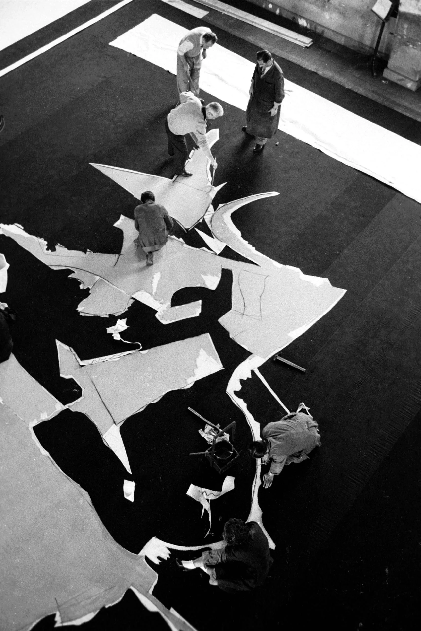 Black and white photograph taken from overhead, five figures working around large white cut shapes on a dark studio floor