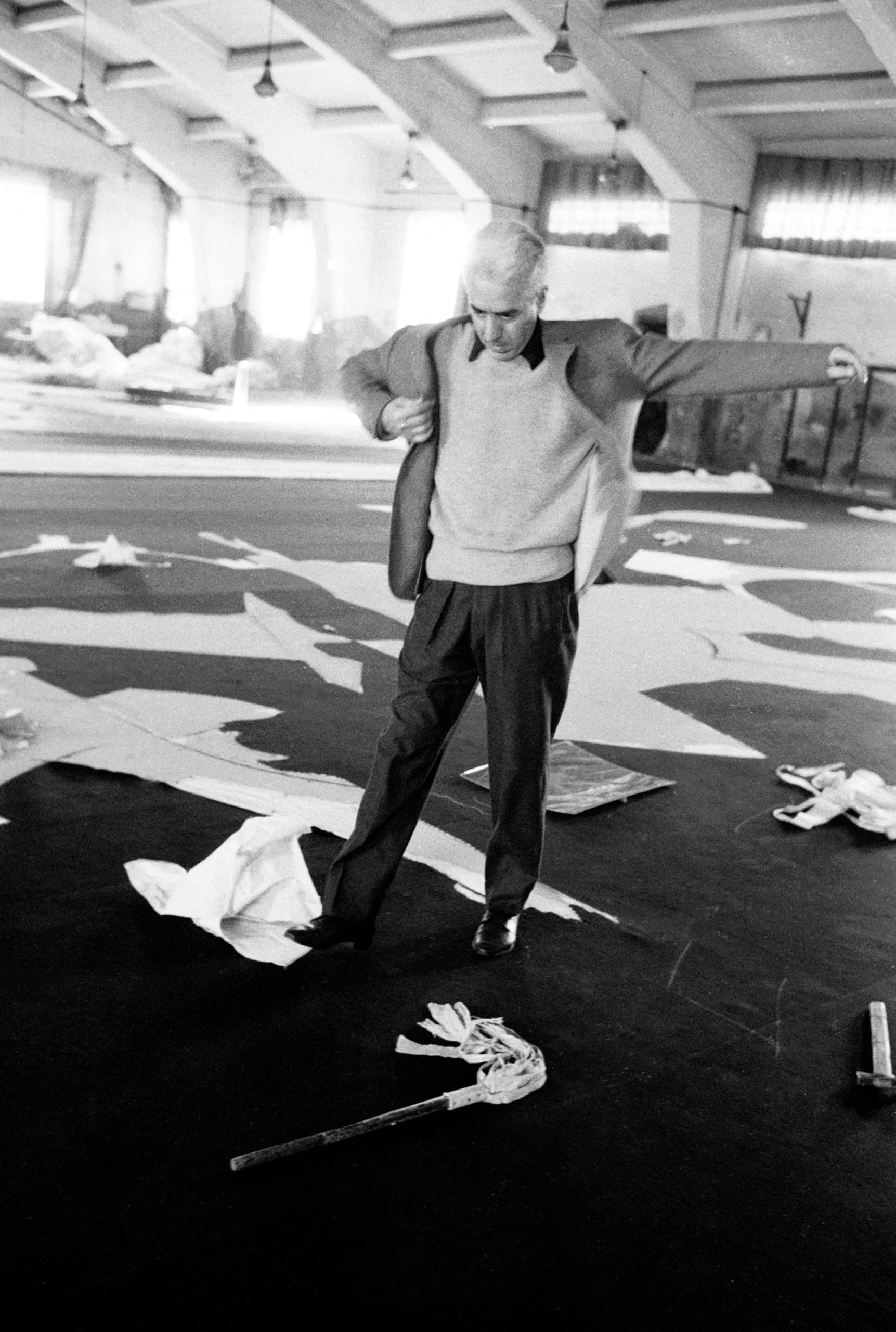 Black and white photograph, full-length view of a gray-haired man in a sweater and blazer standing over a dark studio floor covered with cut white paper or fabric shapes