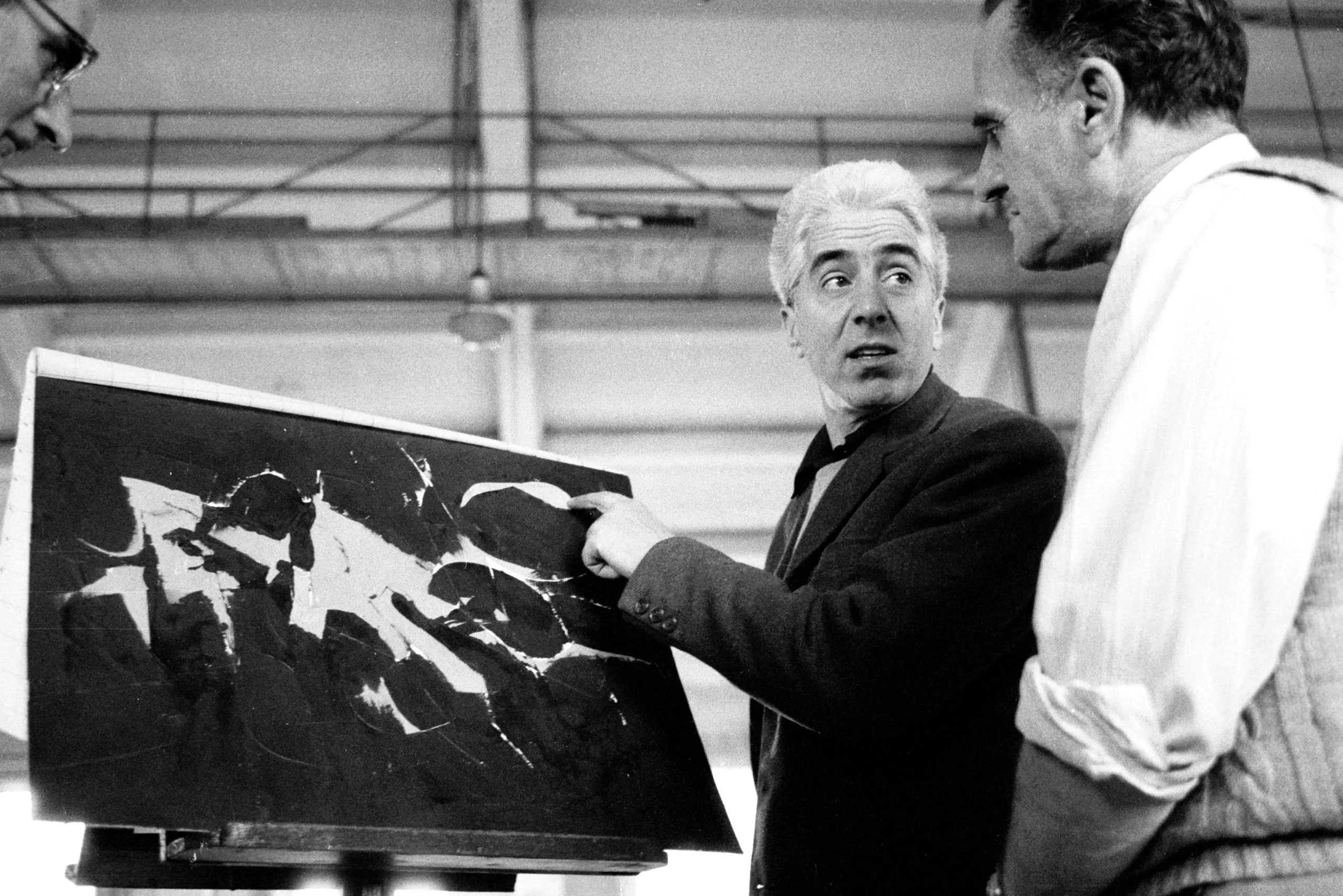 Black and white photograph of two men examining an abstract painting with broad gestural brushstrokes, one pointing at the canvas mid-conversation, in a large industrial interior