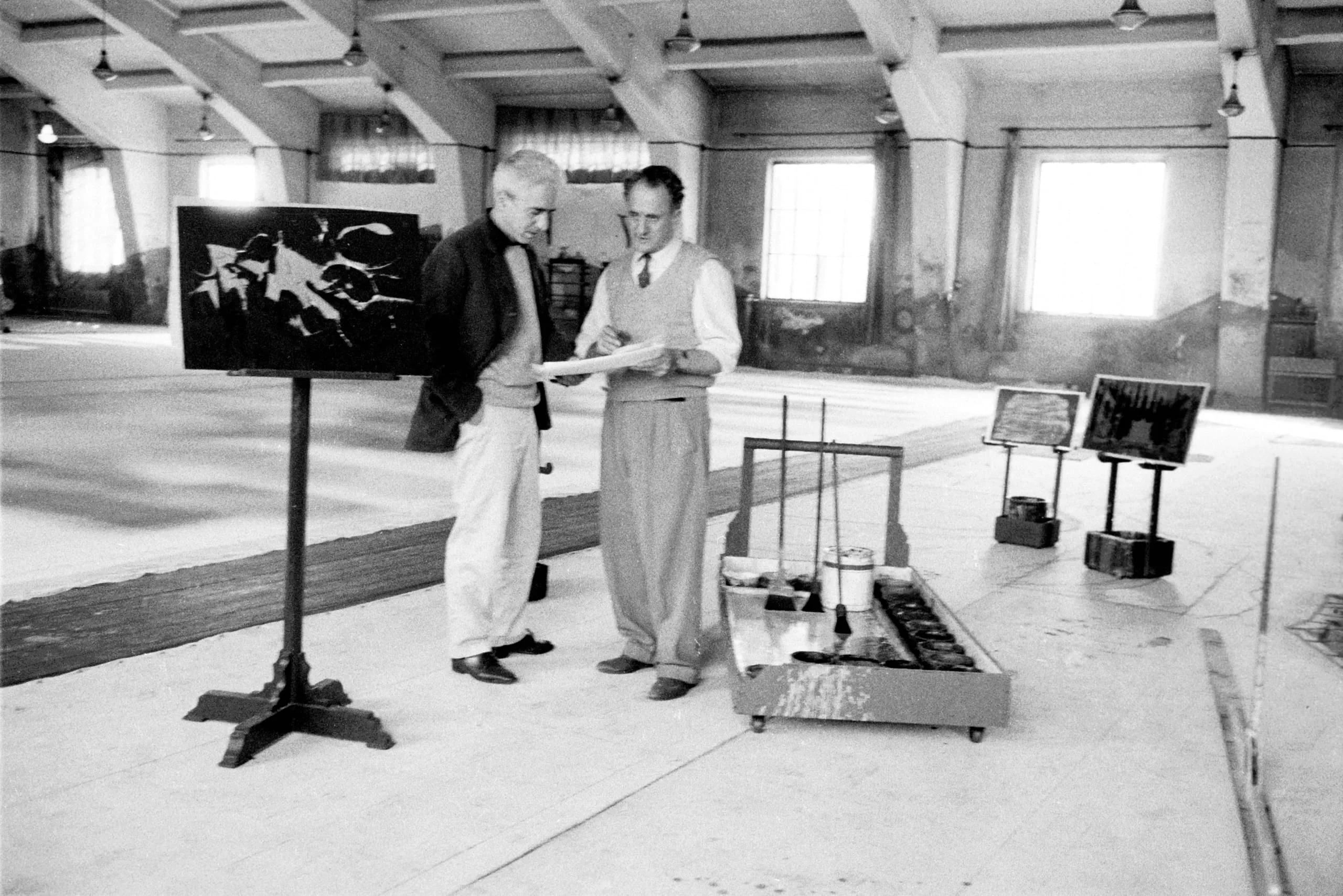 Black and white photograph of two men in a large studio space examining a document, with a high-contrast painting on an easel to the left and art supplies on a wheeled cart nearby