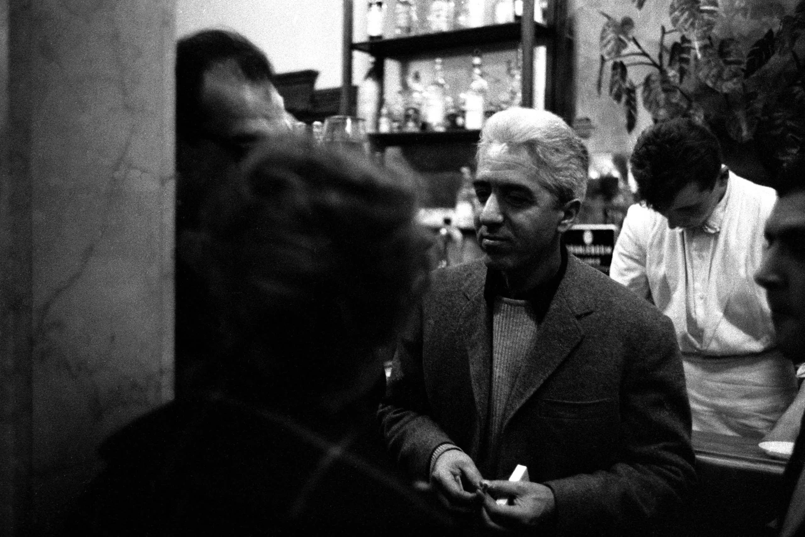 Black and white photograph of three men inside a bar, the central figure with gray-white hair in a dark jacket looking down at a small object in his hands