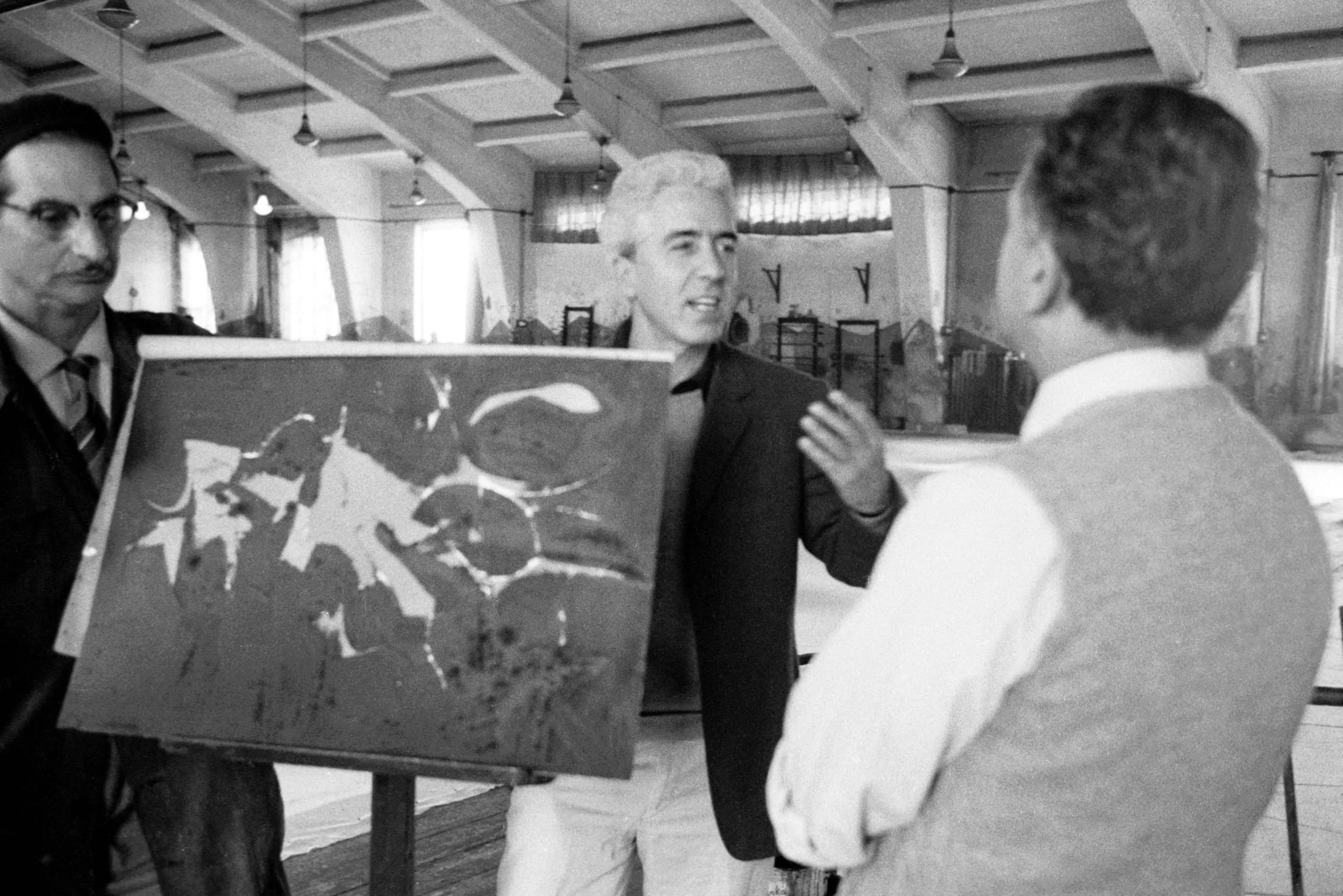 Black and white photograph of three men gathered around an abstract painting on an easel in a large, beam-ceilinged interior