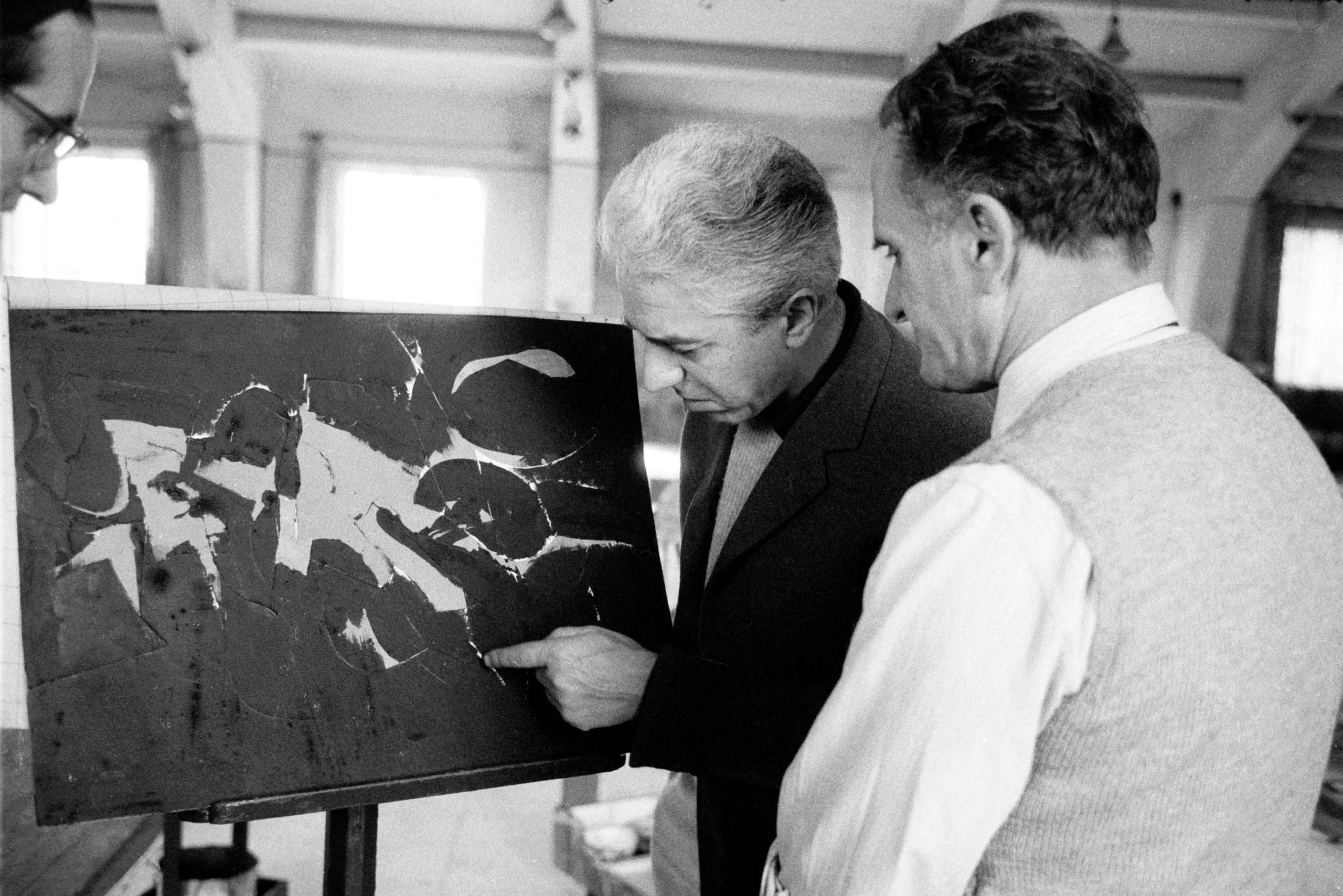 Black and white photograph of two men in a studio examining an abstract painting on an easel, one pointing at the canvas