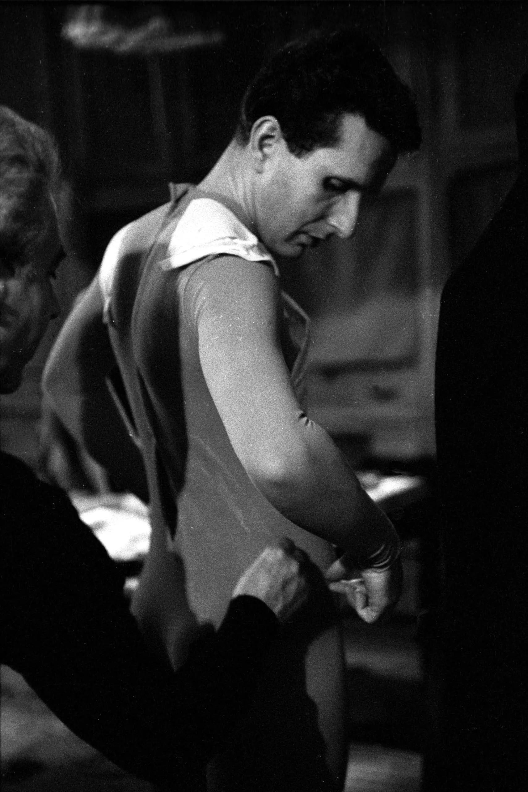 Black and white photograph of a white man in a sleeveless athletic jersey, shown in profile, arms bent, as unseen hands adjust something at his wrist