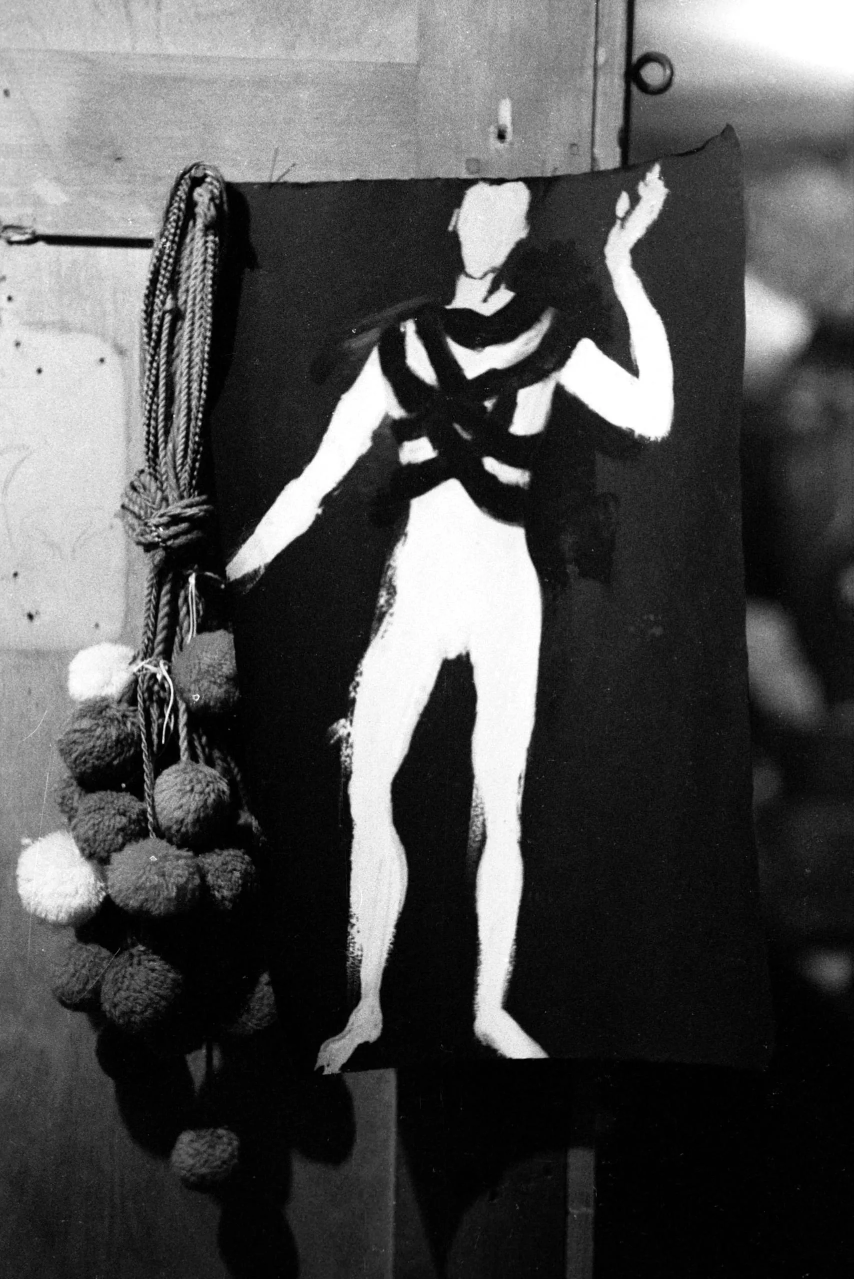 Black and white photograph of a gestural white-painted figure on dark paper pinned to a wood wall, beside a hanging rope with yarn pompoms