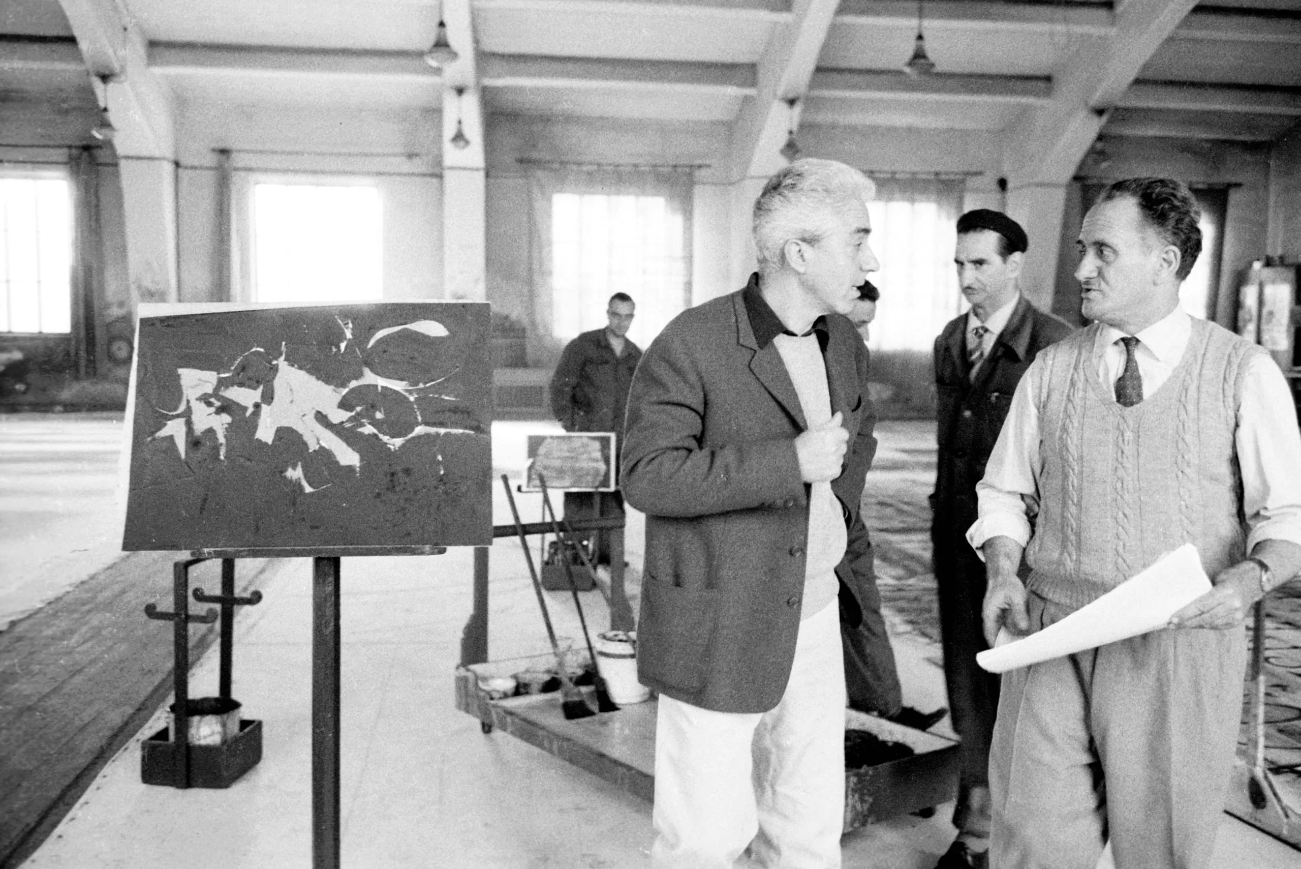 Black and white photograph of two men in conversation in a large interior space, with a dark gestural painting on an easel to the left