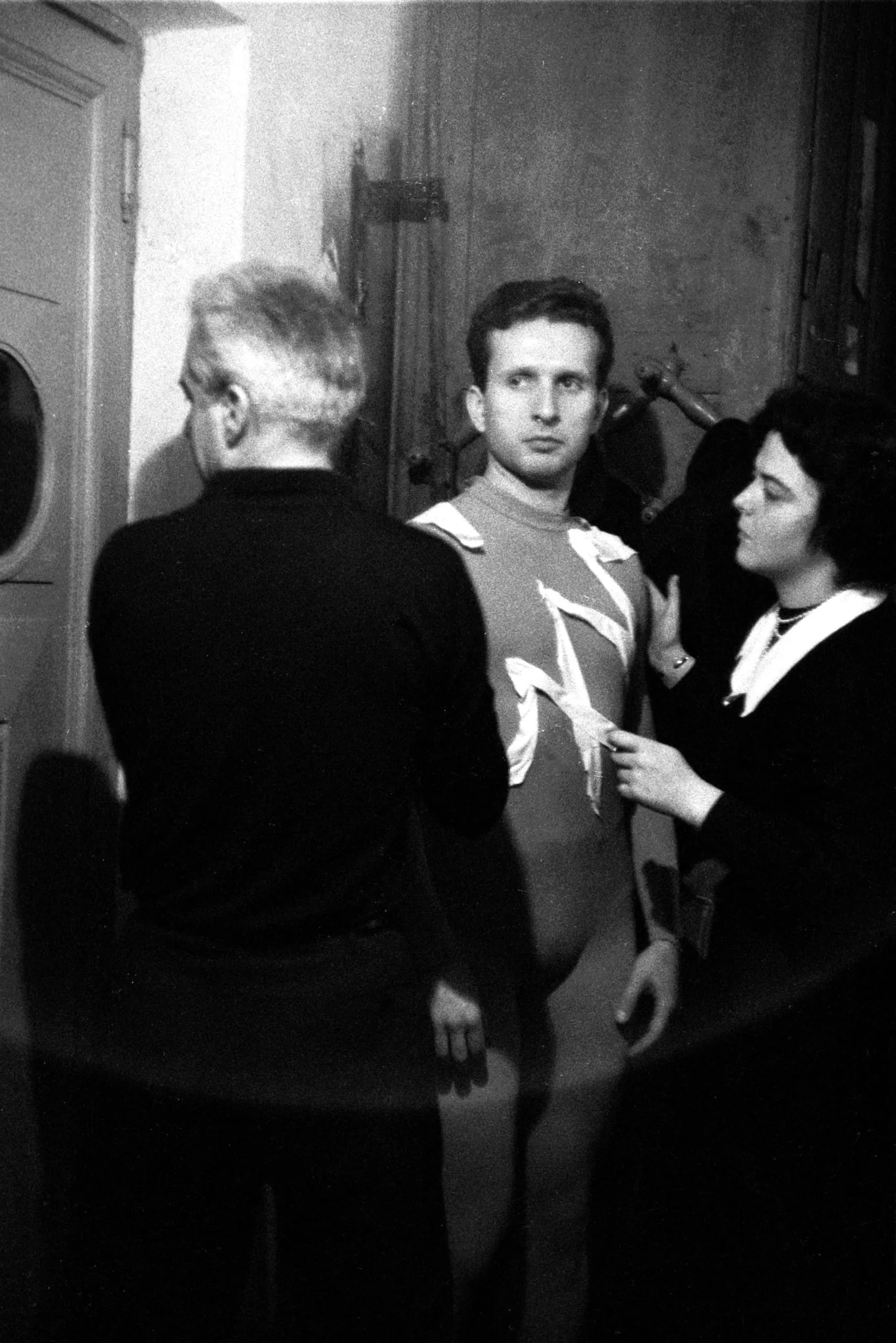 Black and white photograph of three people in a dim interior; a man in a full-body patterned unitard stands facing the camera while two others face him