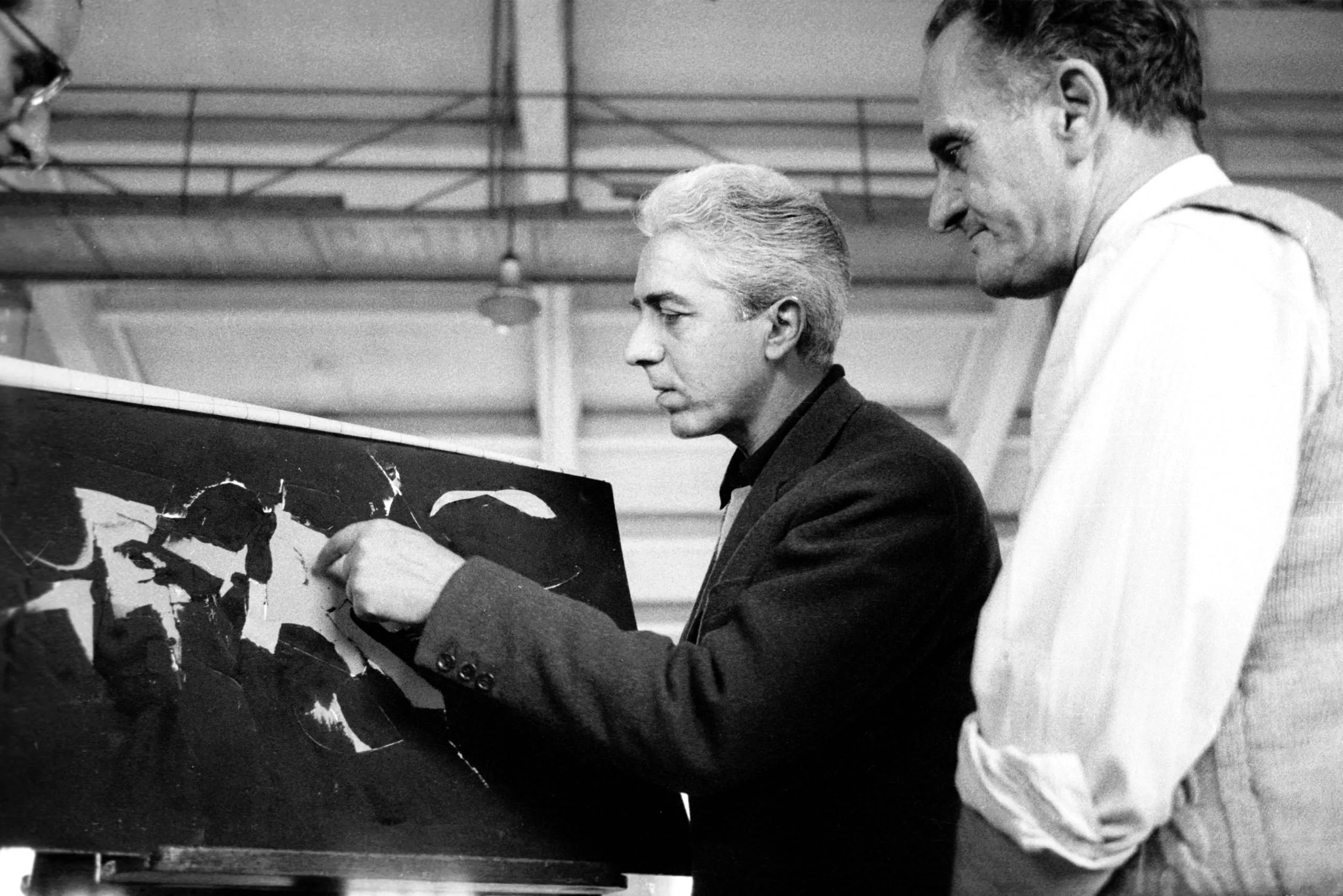 Black and white photograph of two men examining a dark, gestural abstract painting propped at an angle, in a large industrial interior