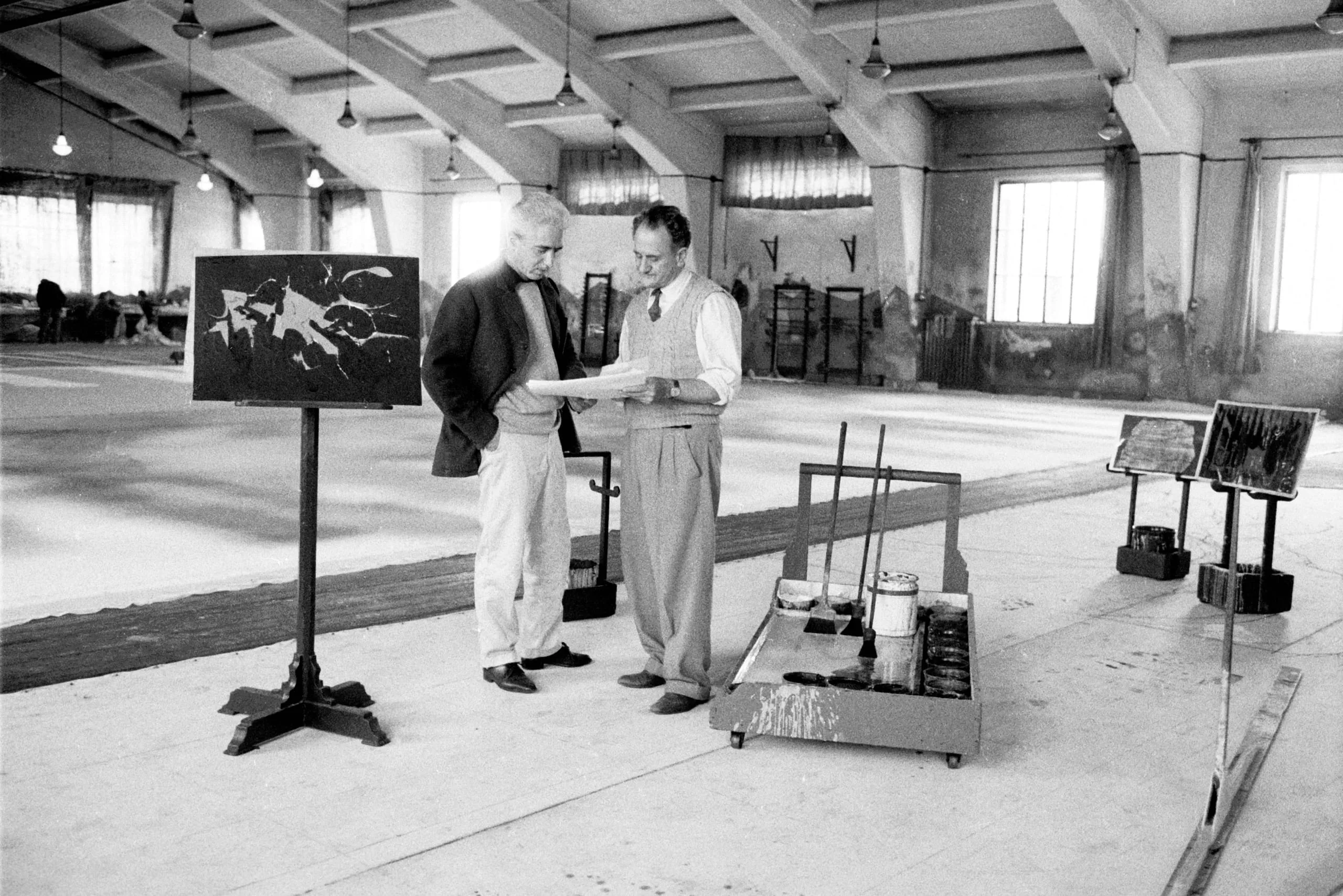 Black and white photograph of two men in an industrial space examining a paper, standing beside an easel displaying an abstract black and white painting