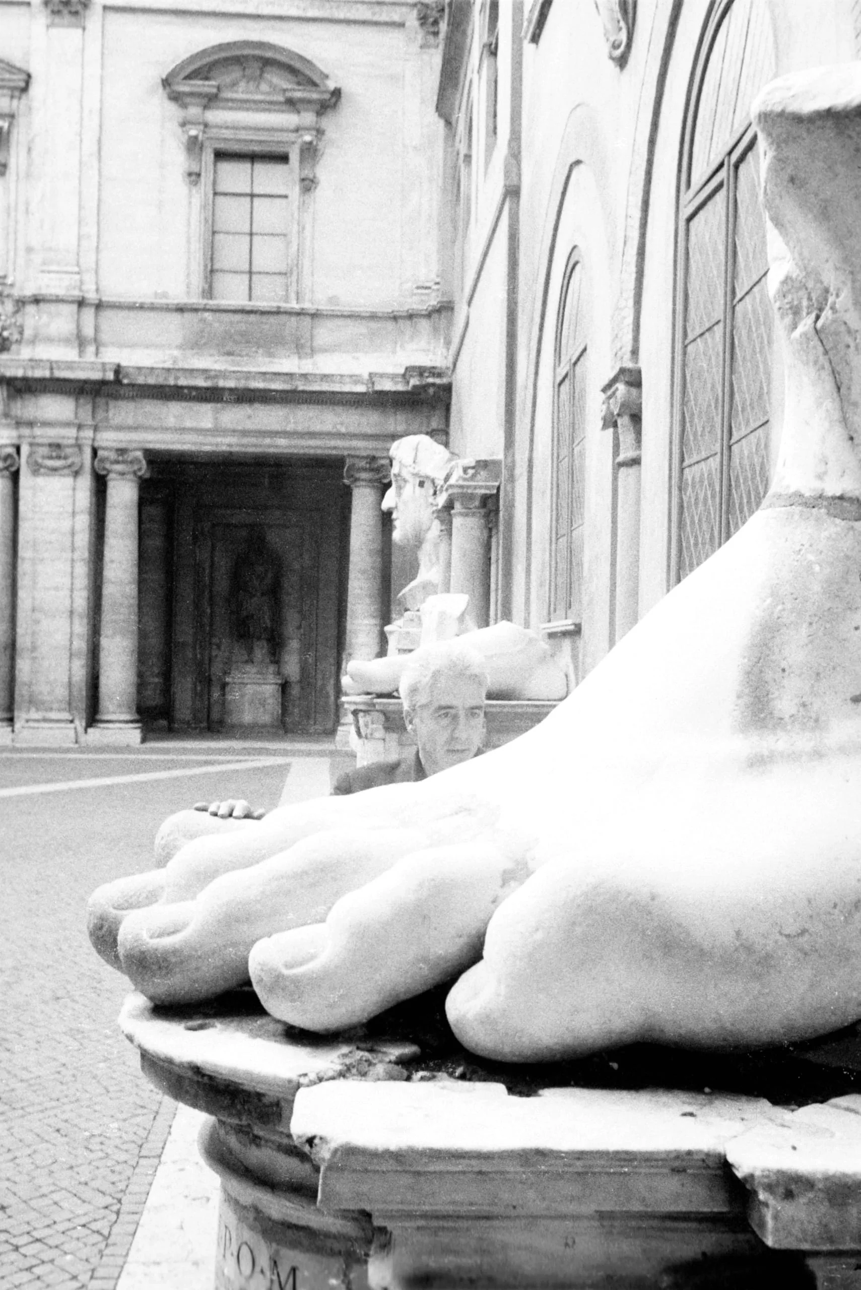 Black and white photograph of colossal ancient marble feet on an inscribed plinth in a classical colonnaded courtyard, with smaller sculpture fragments and a man's face visible in the background