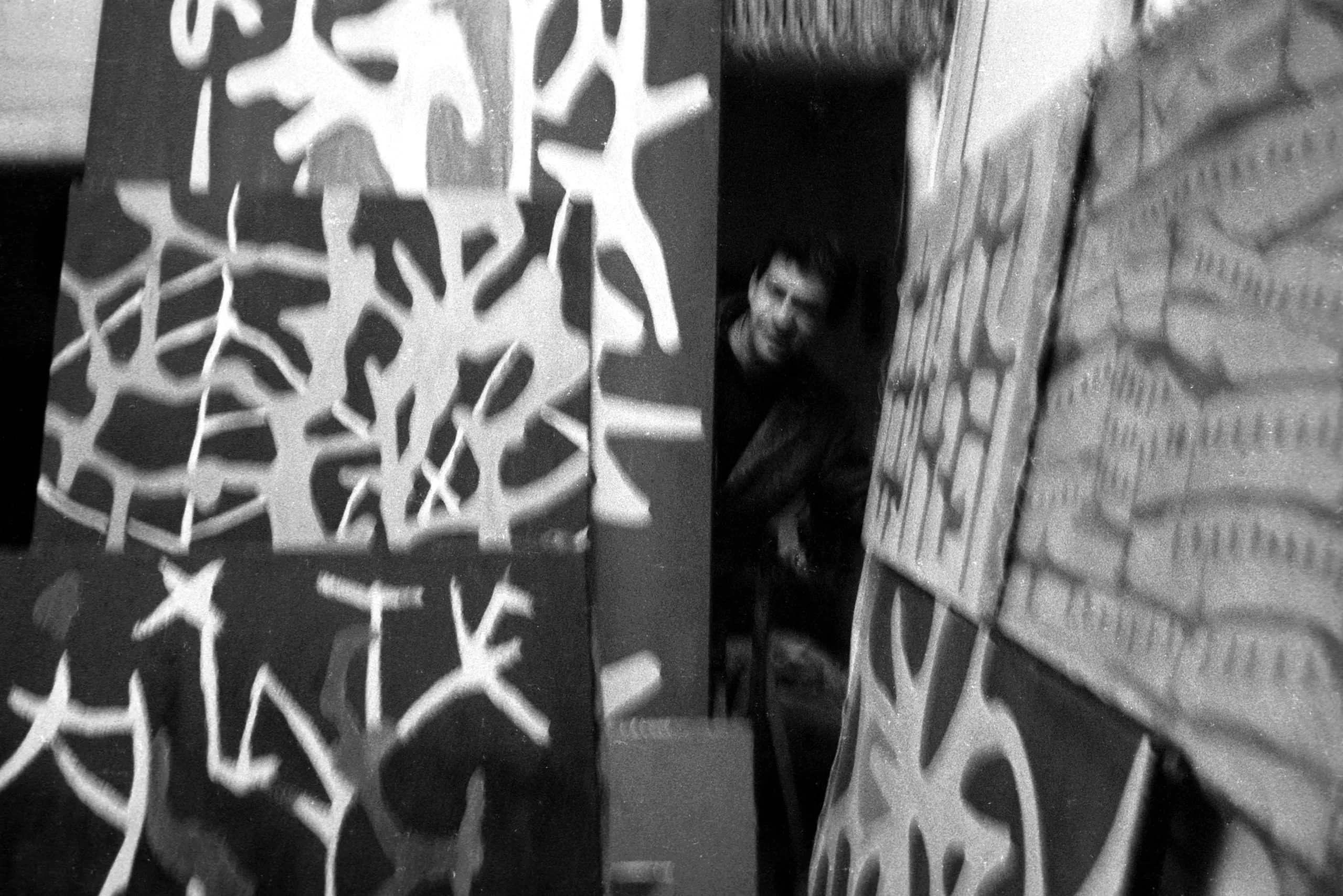 Grainy black and white photograph of a man with dark hair standing between two large dark paintings covered in dense white looping line patterns