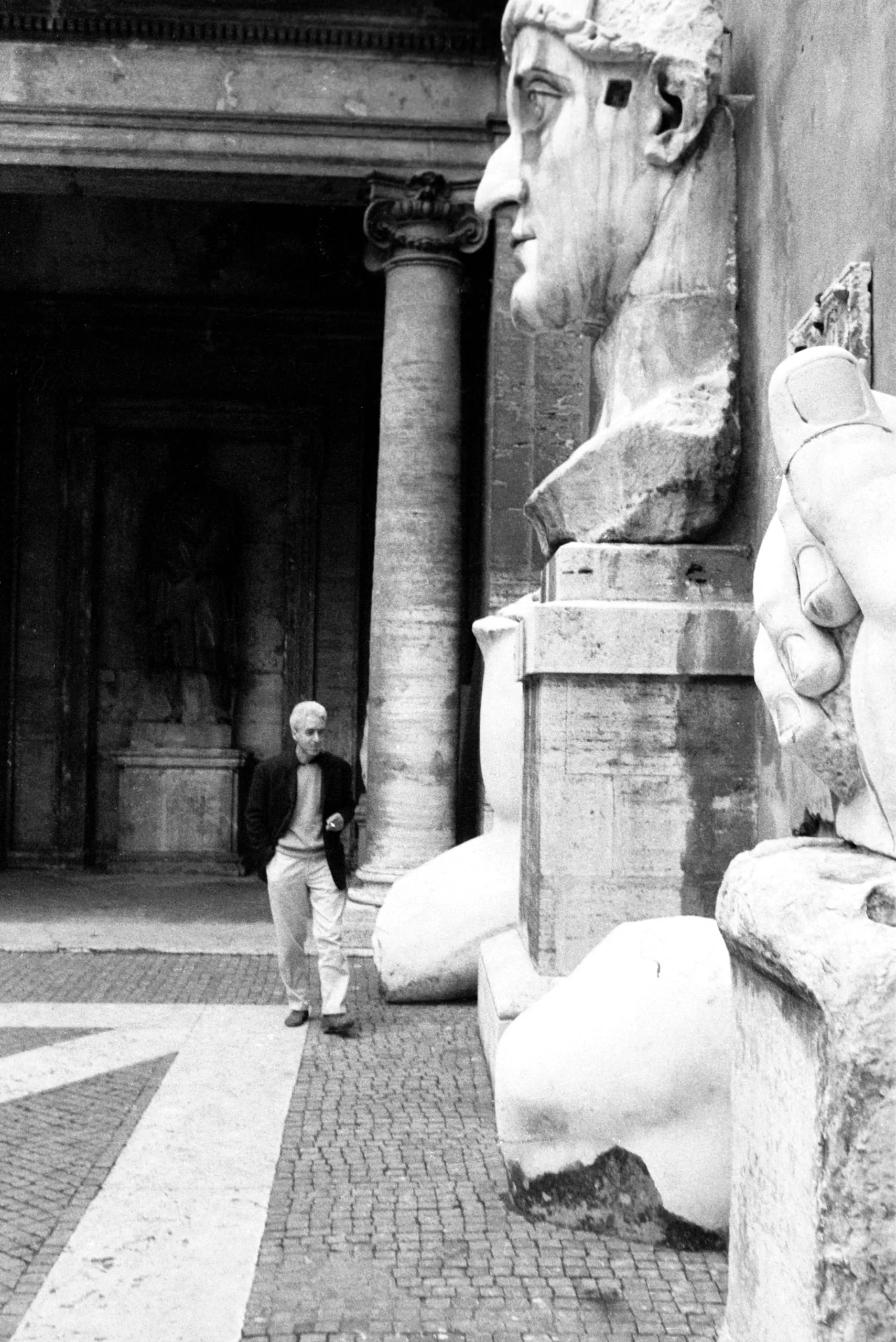 Black and white photograph of a man mid-stride in a classical courtyard, dwarfed by colossal ancient marble sculpture fragments including a profile head and massive hand
