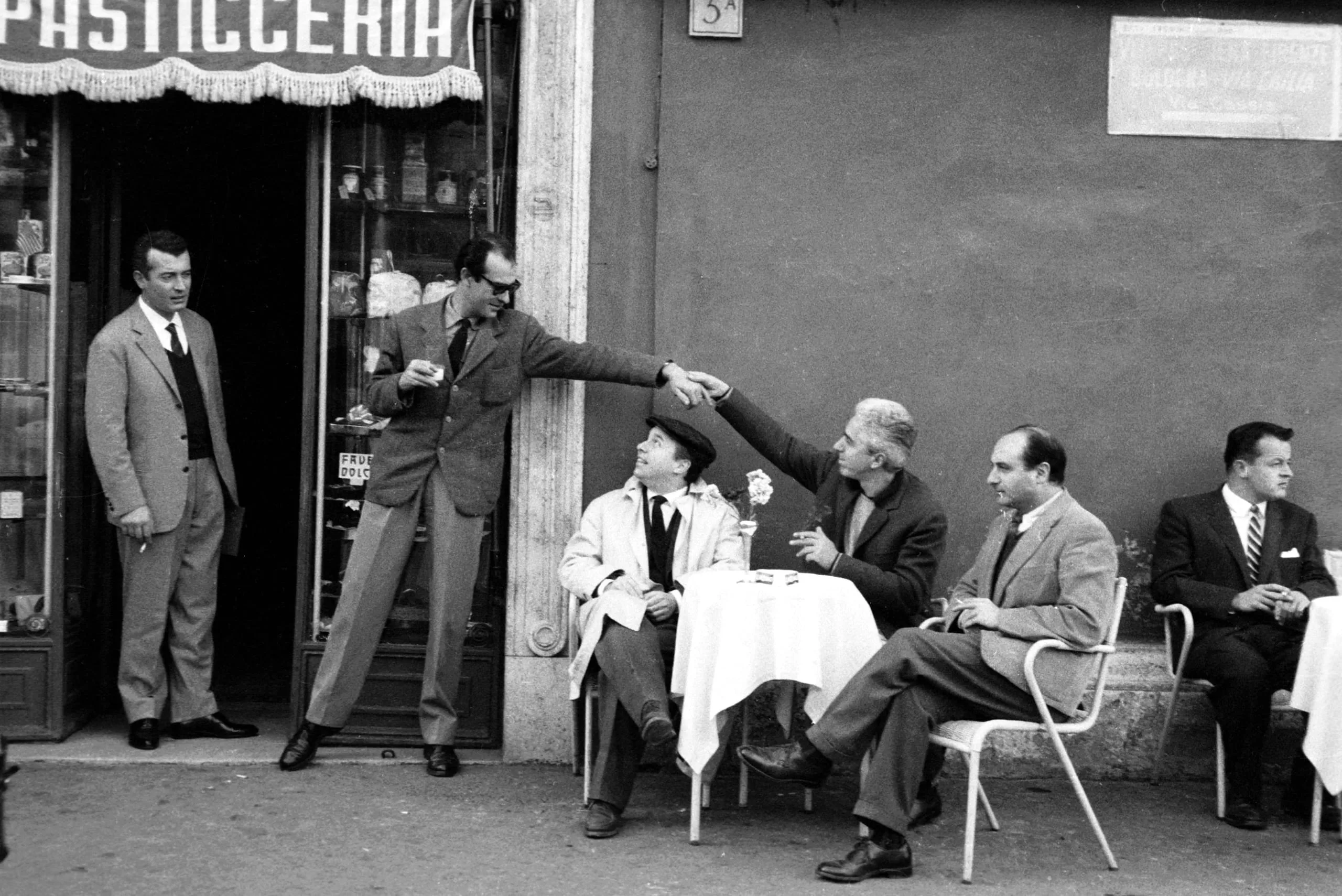 Black and white photograph of six men outside an Italian pastry shop, one standing and reaching to touch a seated man's head at a café table
