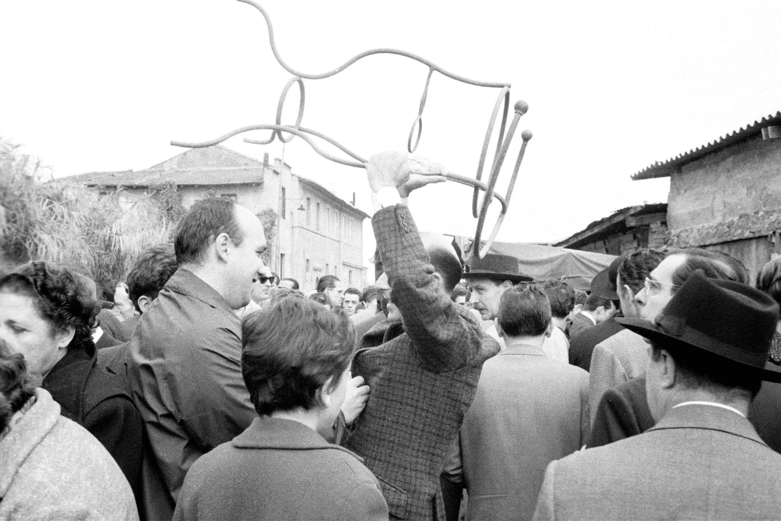 Black and white photograph of a dense outdoor crowd, a man in a tweed jacket raising a wire-frame chair overhead against a pale sky