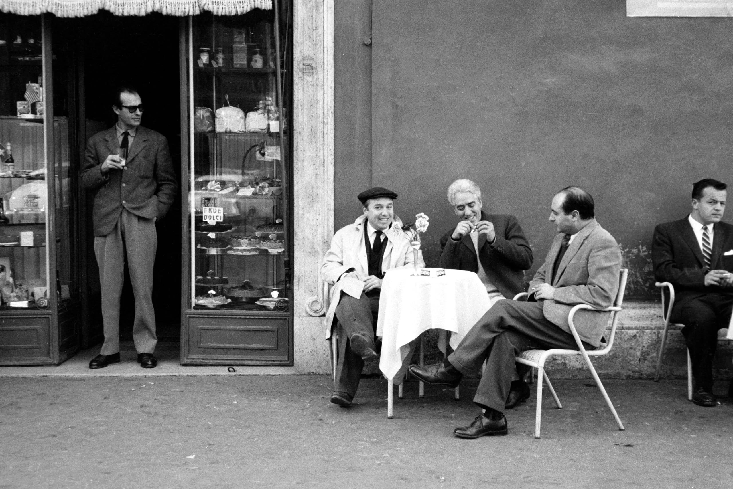 Black and white photograph of five suited men on a European sidewalk, one standing in a shop doorway, three seated at a white-clothed café table, one seated apart