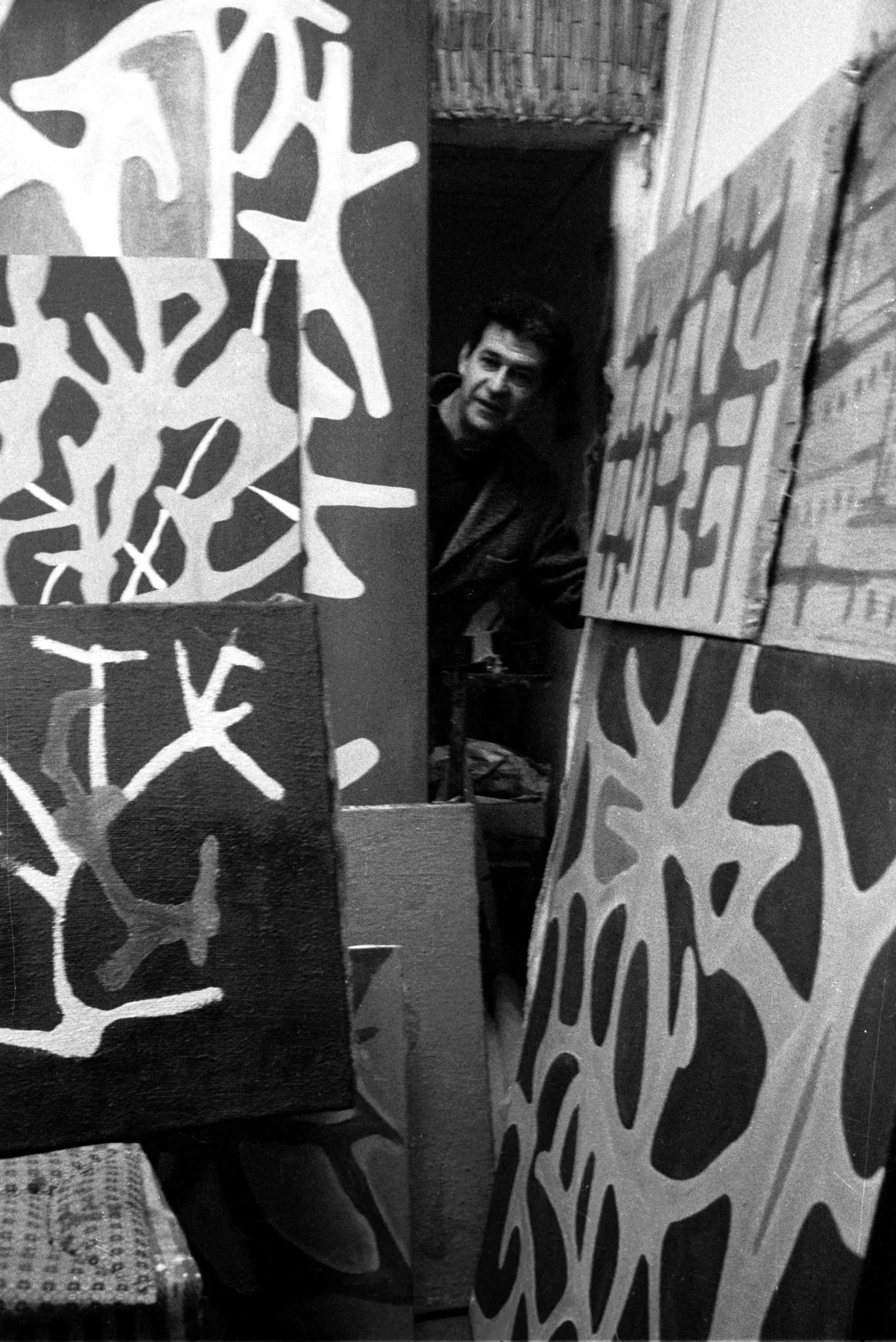Black and white photograph of a dark-haired man peering through a doorway surrounded by large abstract canvases in a crowded studio
