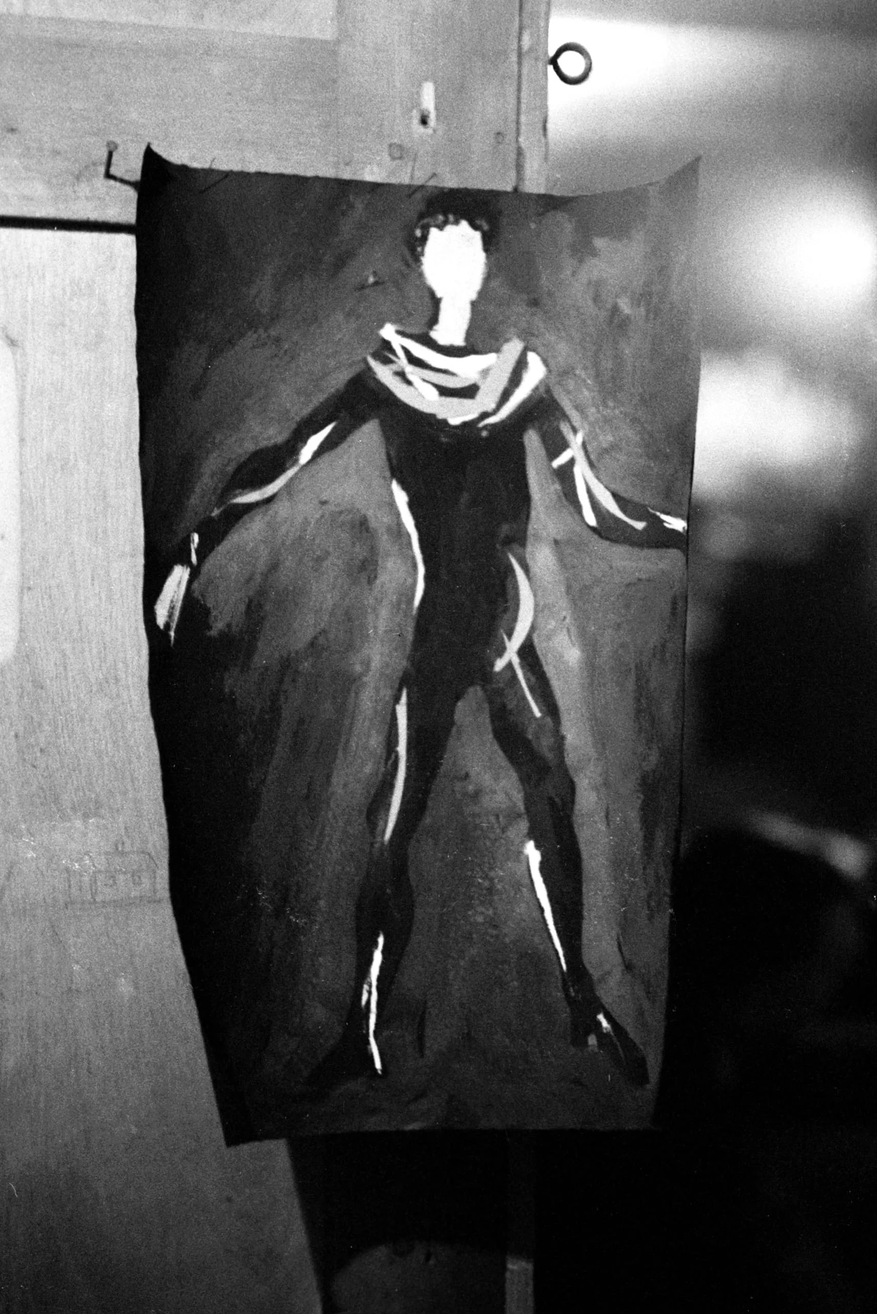 Black and white photograph of a loose ink or paint study on dark paper, depicting a standing figure with outstretched arms and a blank white oval for a face, mounted on a wooden easel