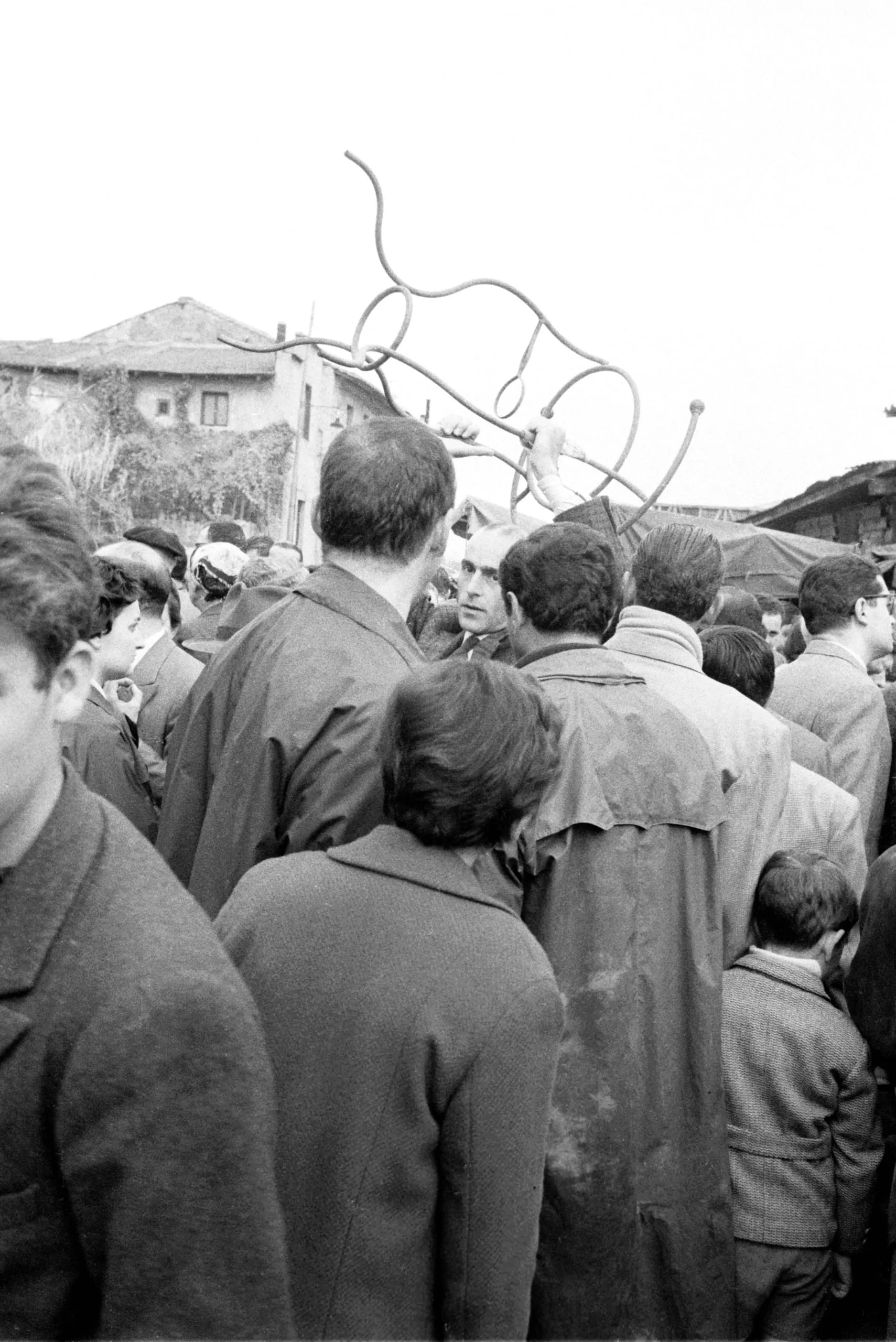 Black and white photograph of a dense outdoor crowd in heavy coats, with a tangle of curved metal rods rising above the crowd against an overcast sky