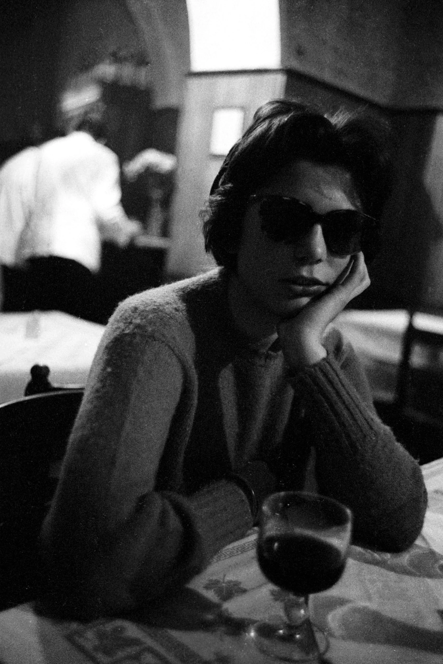 Black and white photograph of a white woman seated at a restaurant table, wearing dark sunglasses and a ribbed sweater, resting her cheek on one hand, with a wine glass in the foreground