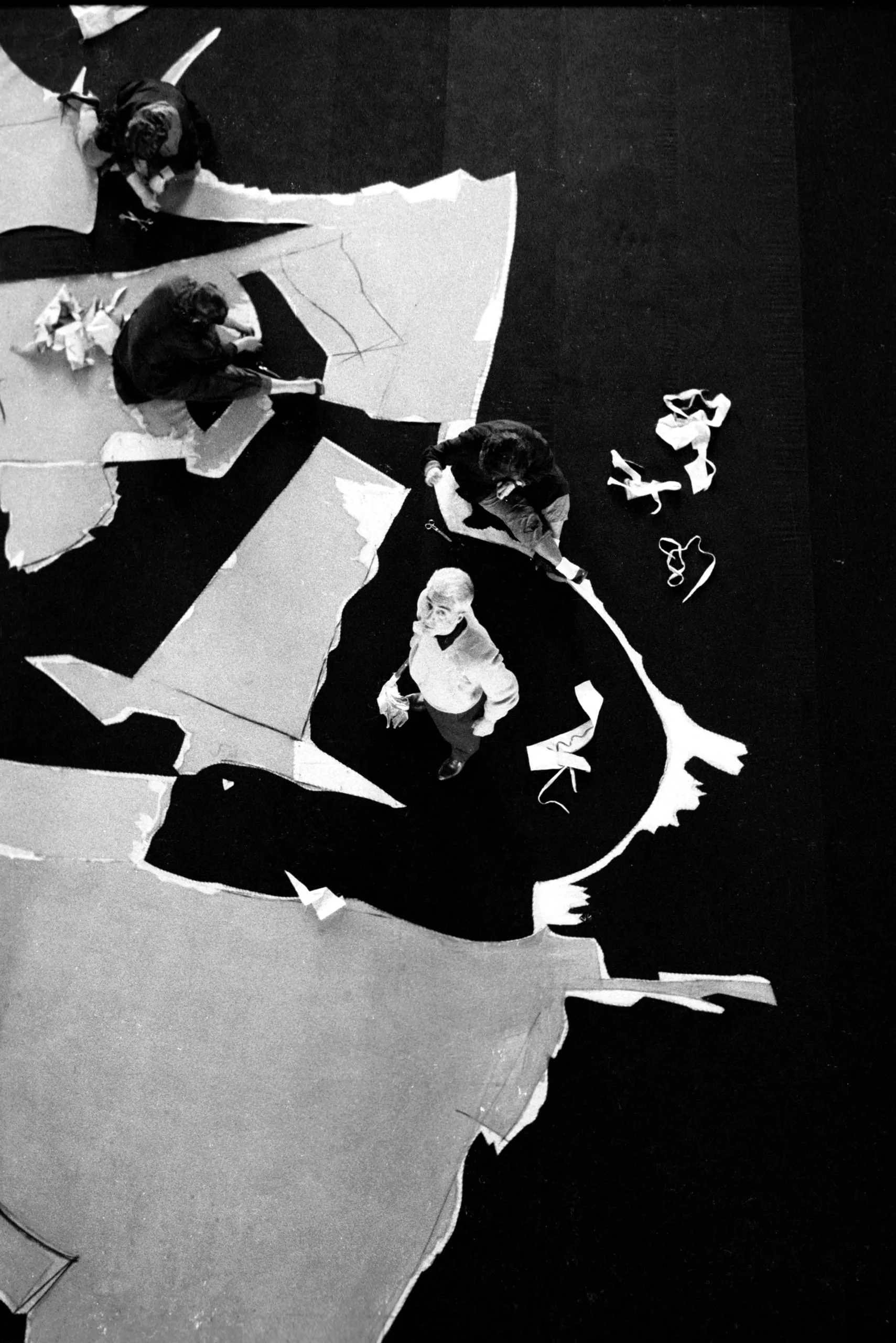 Black and white photograph shot from overhead, showing four figures working on a large-scale paper composition spread across a dark floor