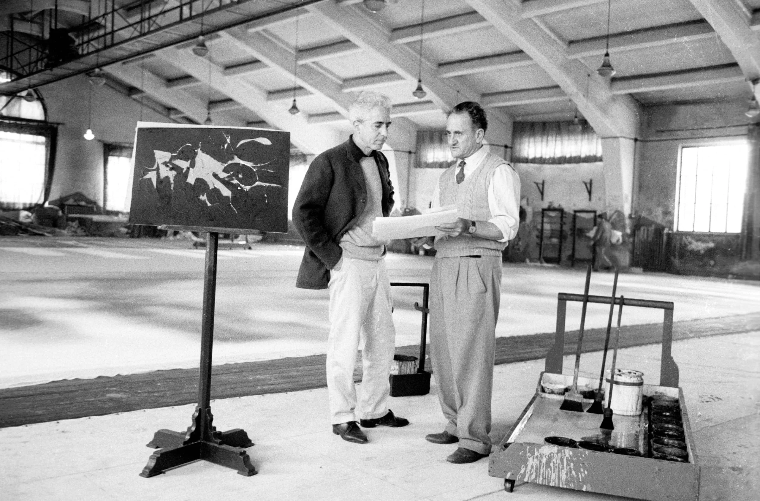 Black and white photograph of two men in an industrial studio examining a document, with a dark abstract painting on an easel to the left and paint cans on a metal cart to the right