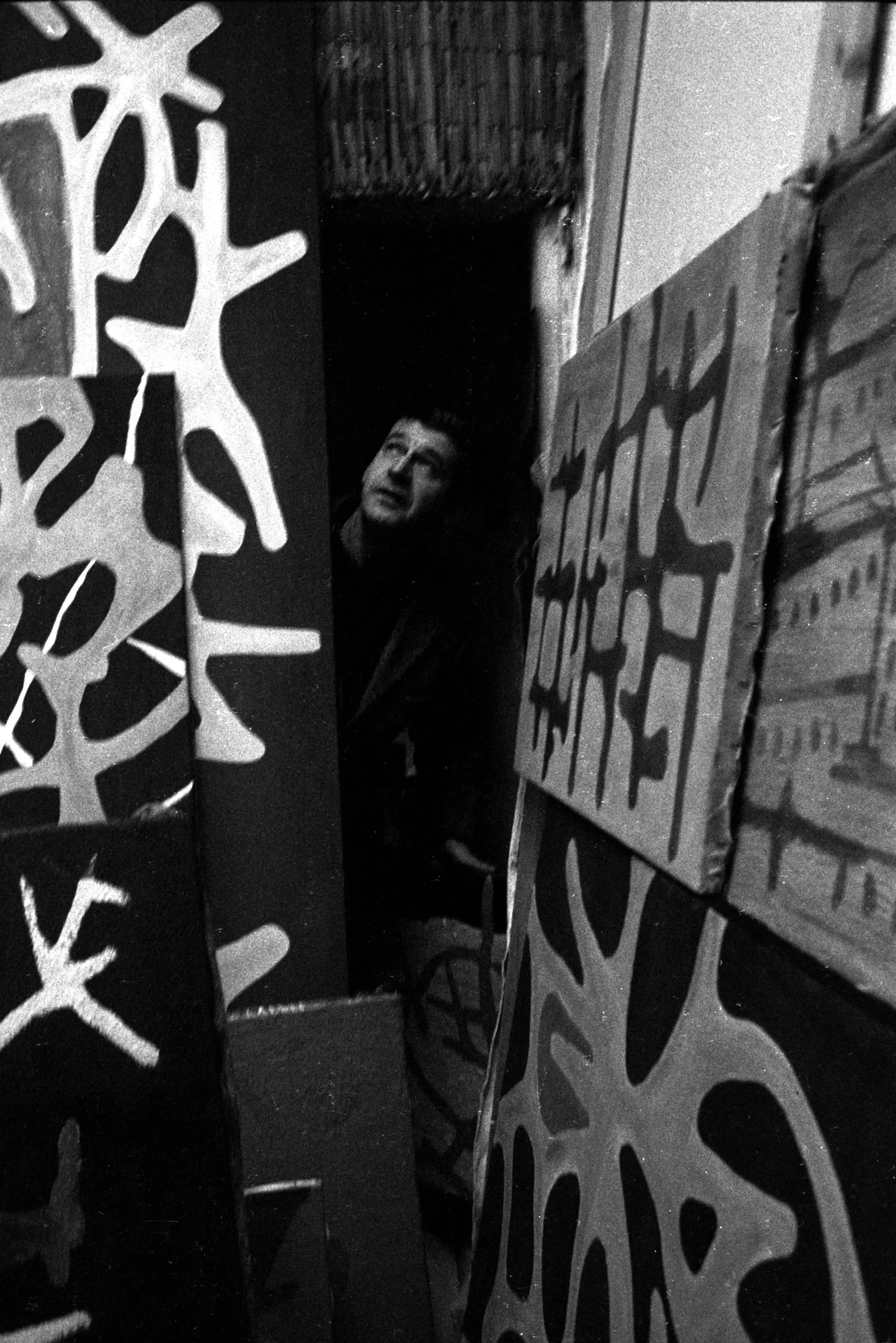 Black and white photograph of a man in a shadowed doorway flanked by large canvases covered in bold, branching abstract marks