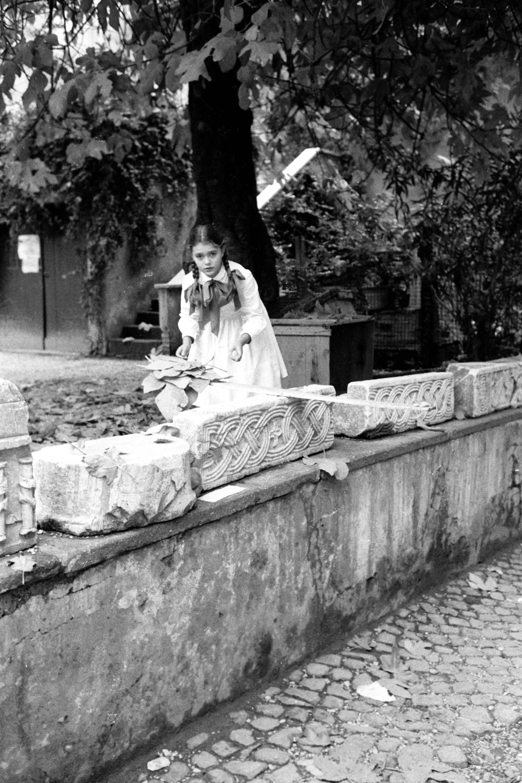 Black and white photograph of a young girl in a white dress leaning over a stone wall topped with carved architectural fragments, looking at the camera
