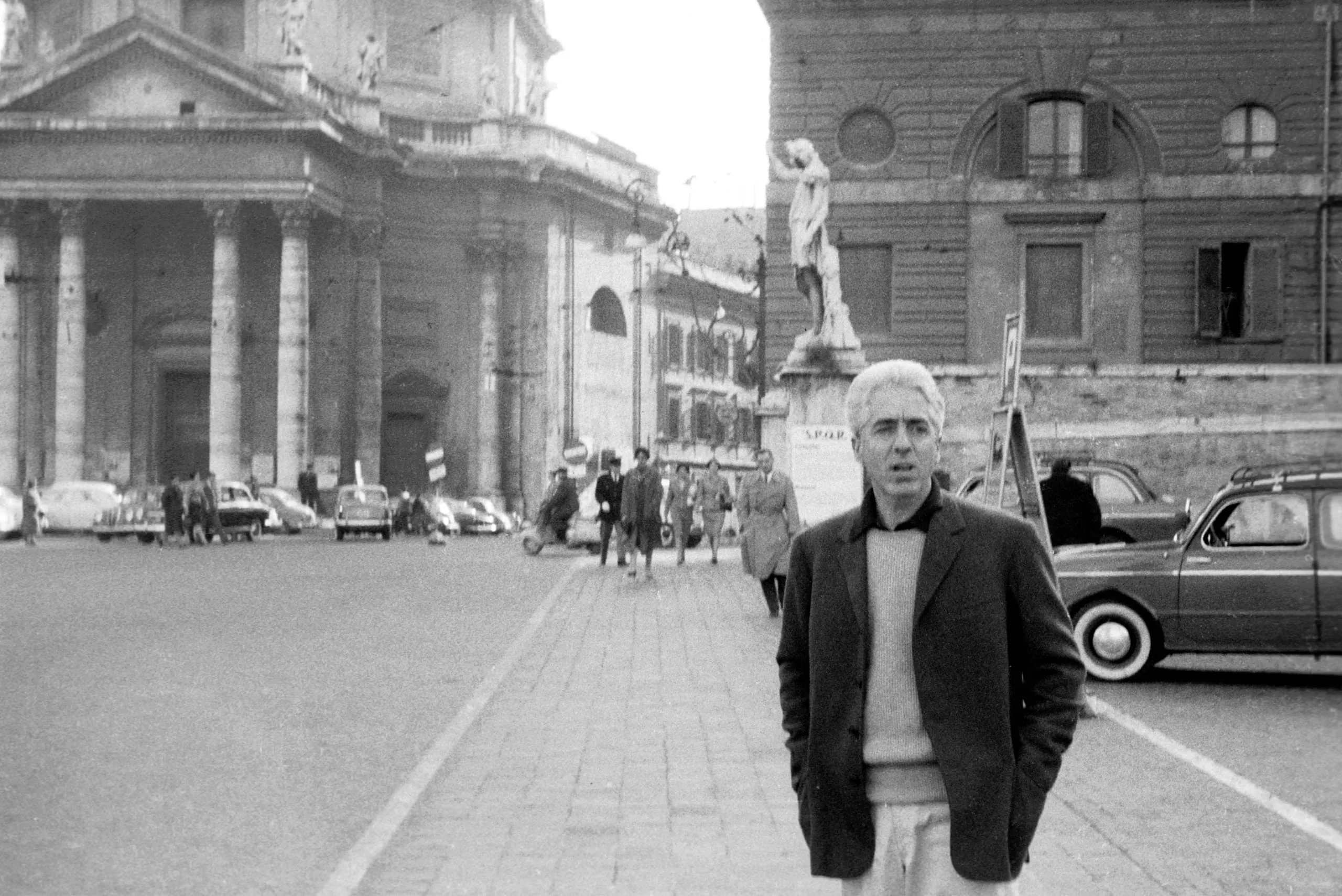 Black and white photograph of a white man in a dark blazer and light sweater standing in a large Italian piazza, with a domed church, parked vintage cars, and a statue on a pedestal in the distance