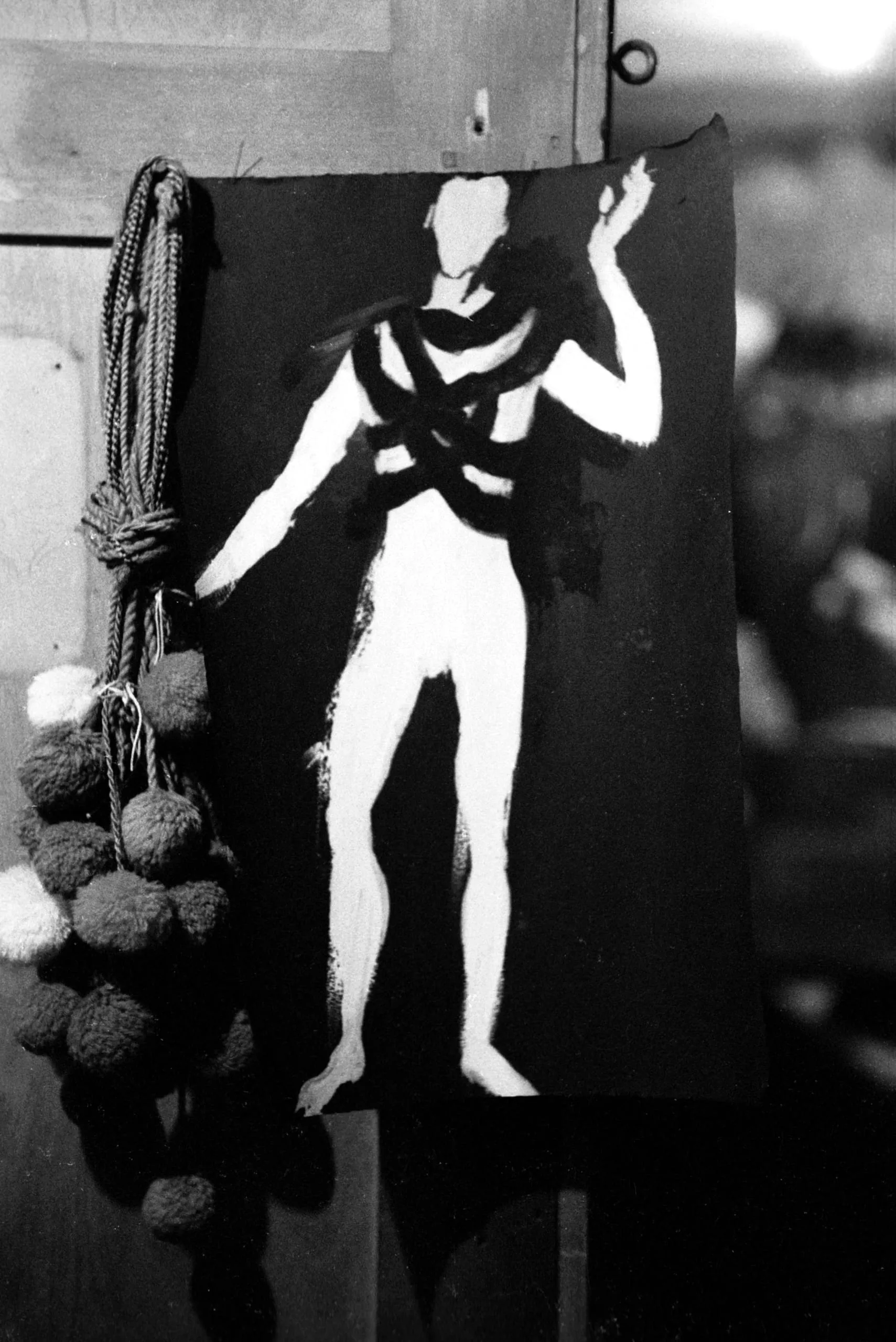 Black and white photograph of a gestural figure painting in white on dark paper, with a cluster of yarn pompoms and braided rope hanging beside it