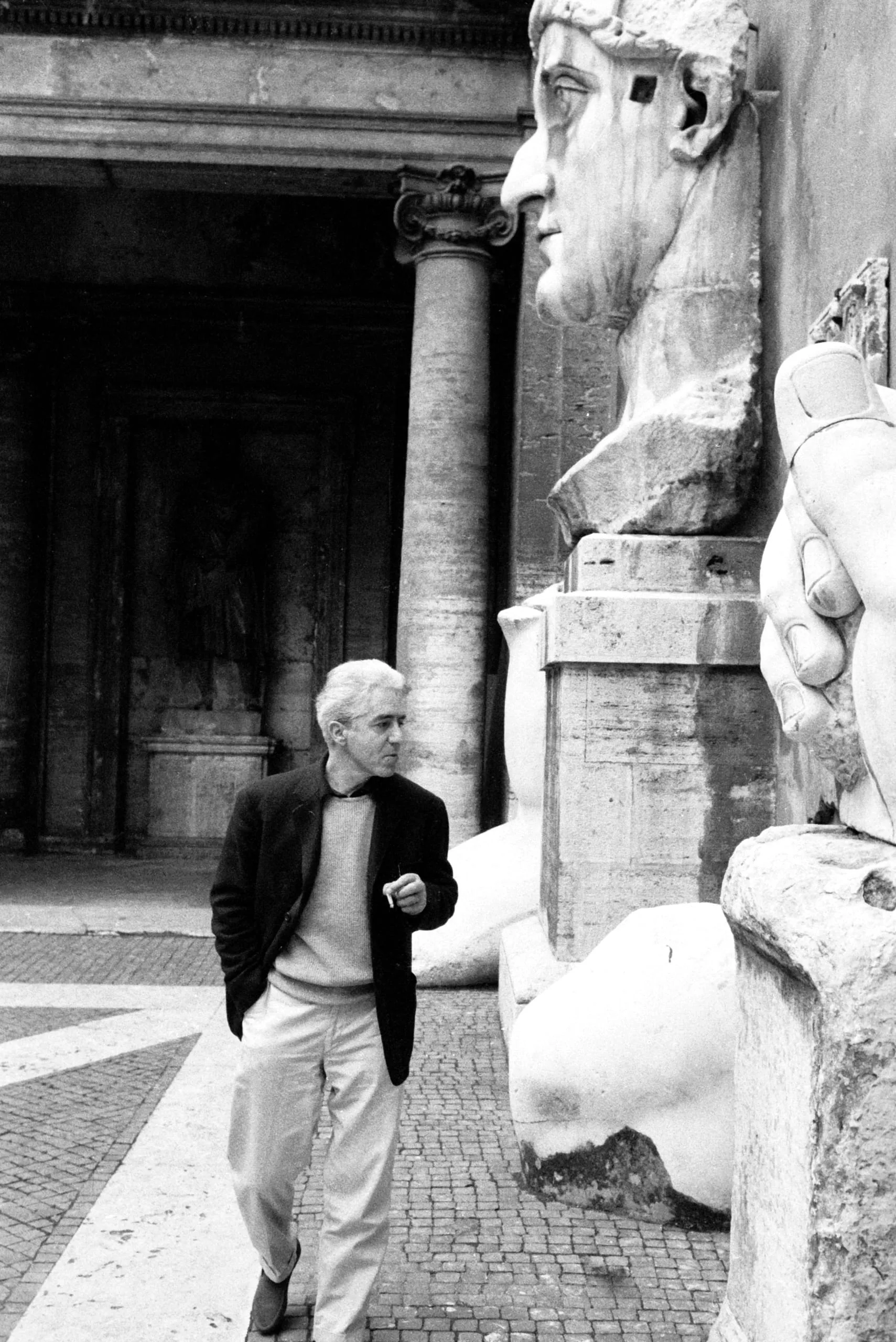 Black and white photograph of a man in a dark blazer standing beside colossal ancient Roman marble sculpture fragments, including a massive head in profile, in a classical courtyard