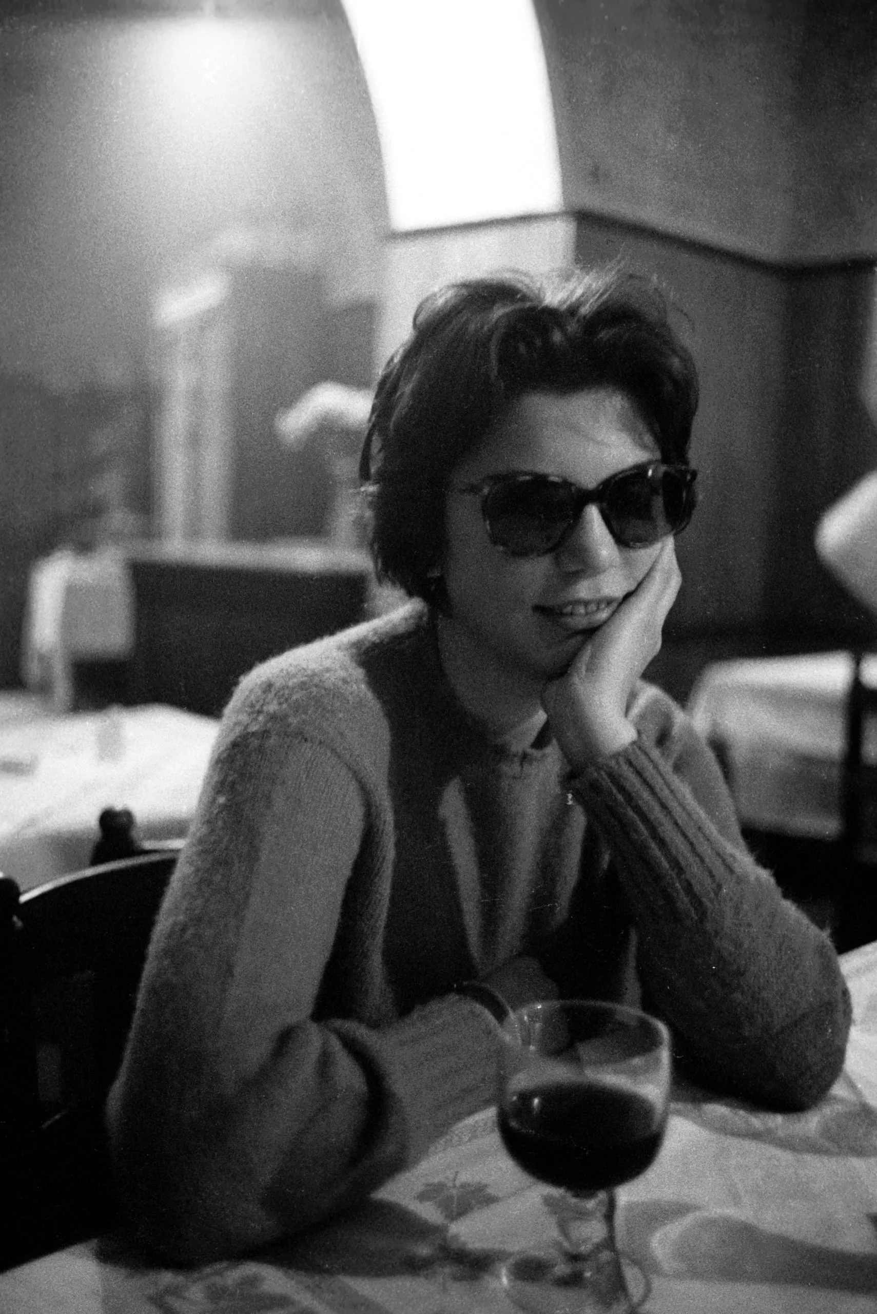 Black and white photograph, woman in dark sunglasses seated at a restaurant table, resting cheek on hand, wine glass in foreground