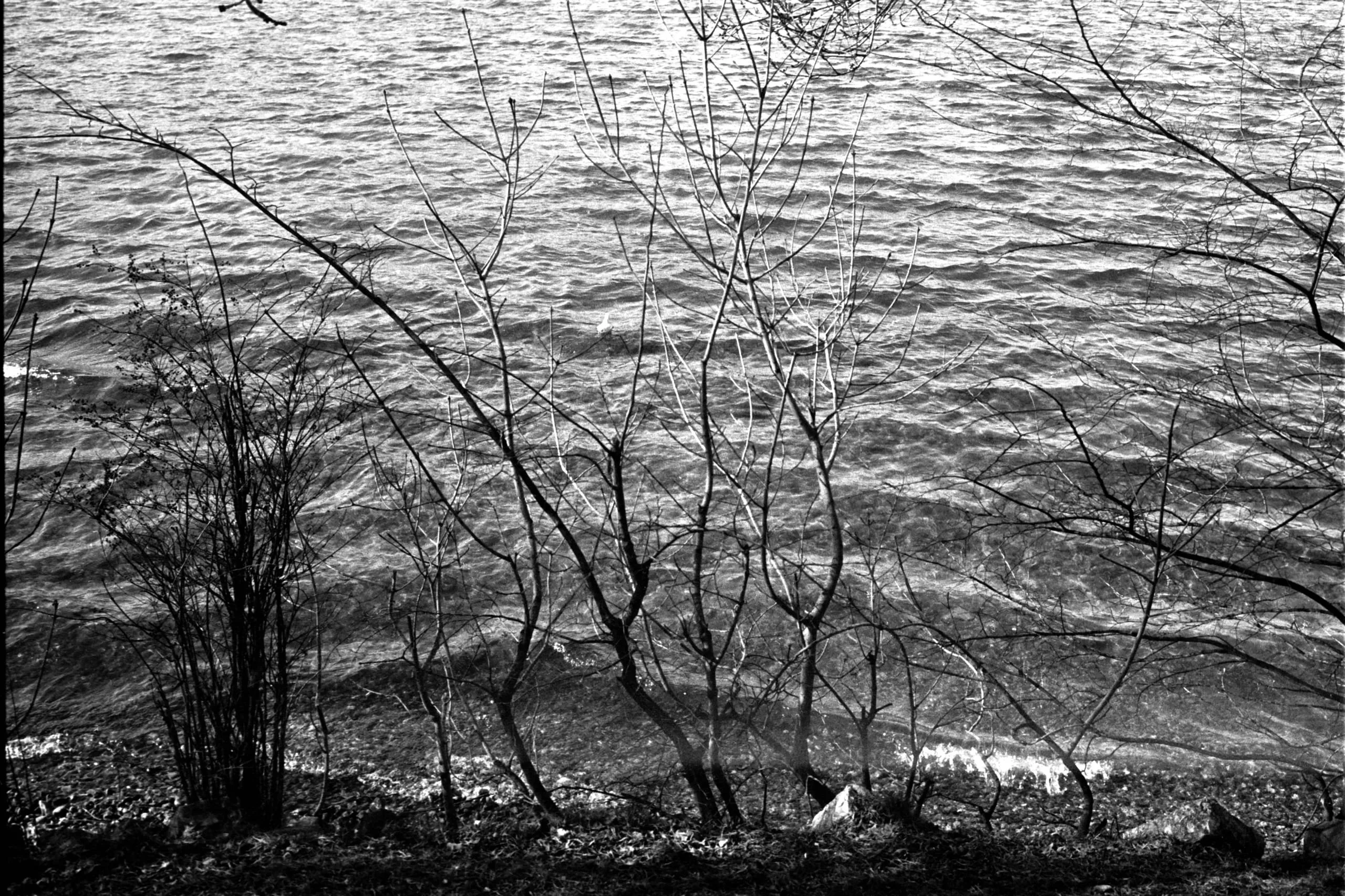 Black and white photograph looking down onto a rocky shoreline with bare, leafless shrubs silhouetted against the rippling surface of a body of water