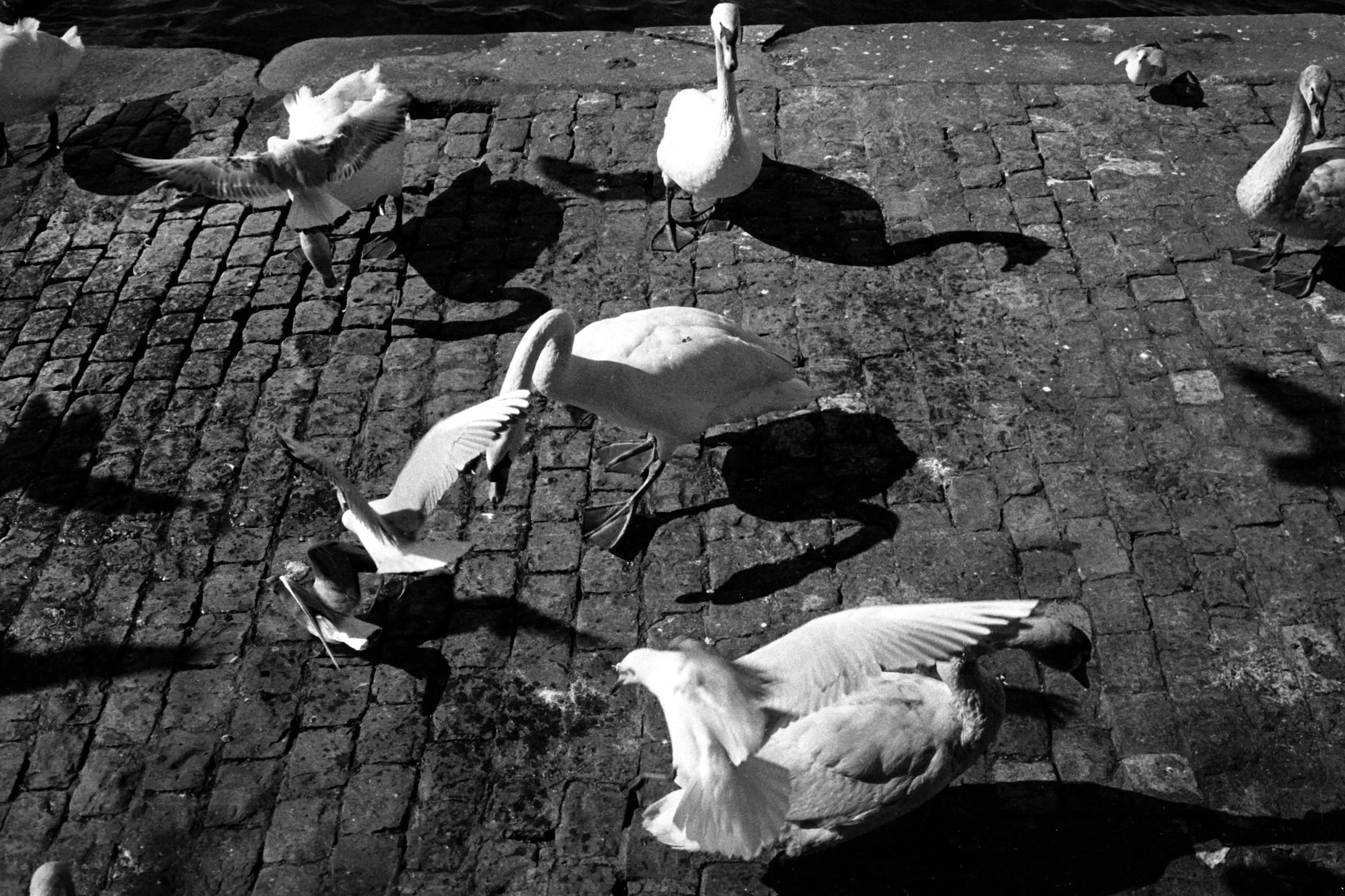 Black and white photograph, shot from above, of swans and seagulls on a cobblestone surface in harsh, high-contrast light with deep shadows
