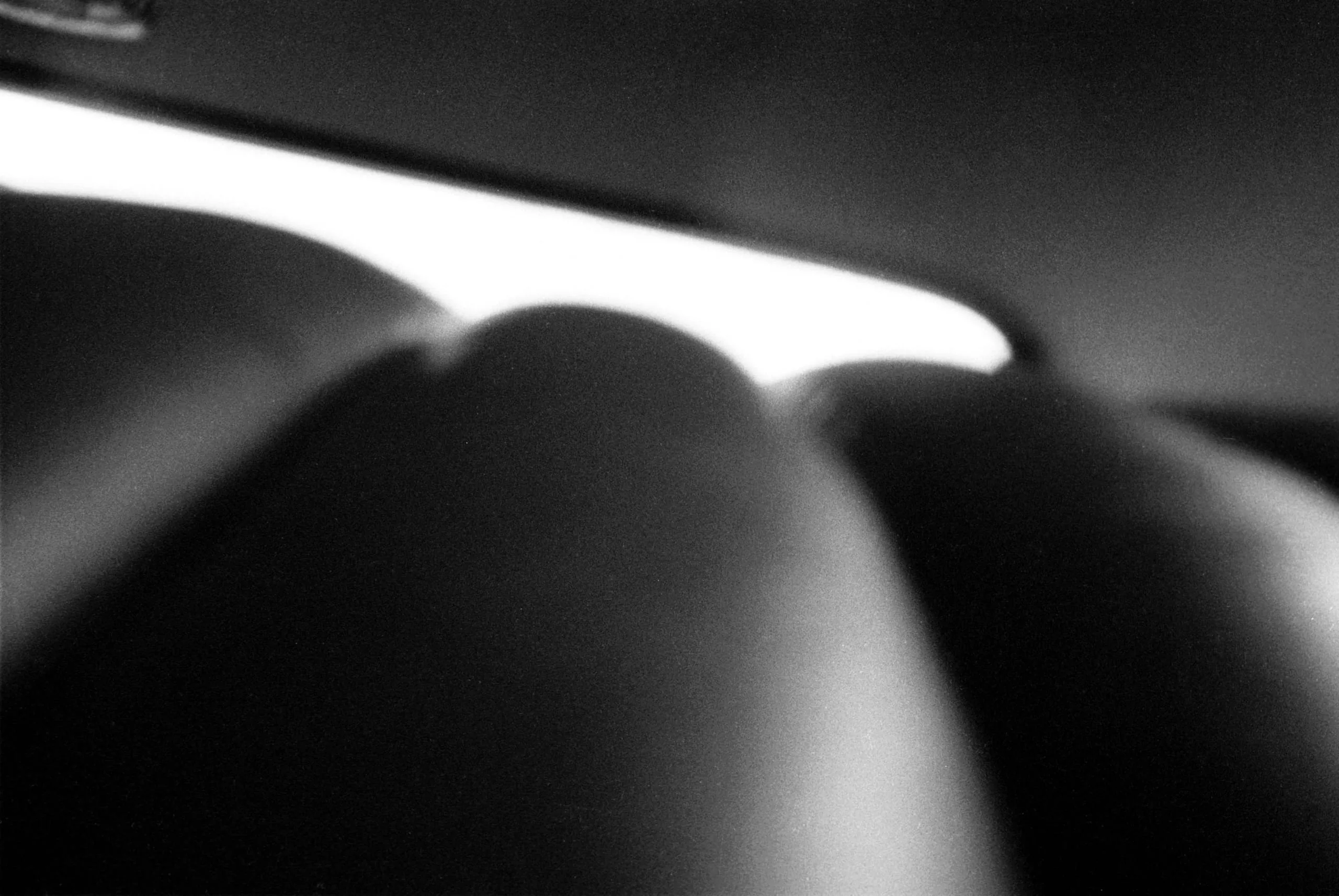 Black and white photograph, extreme close-up of knuckles silhouetted against a bright horizontal band of light, soft focus with high contrast