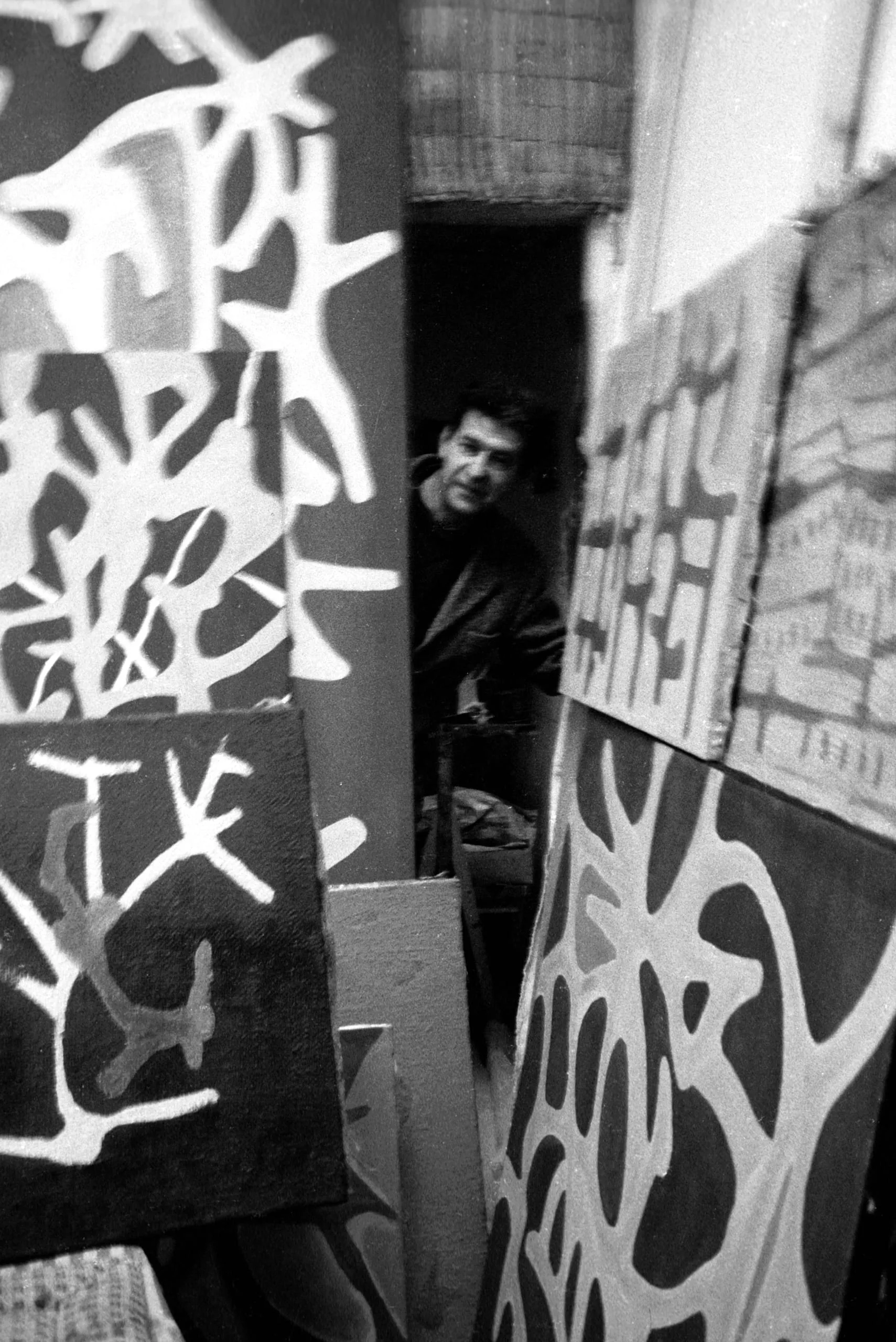 Black and white photograph of a dark-haired man standing in a narrow doorway, surrounded by large canvases painted with bold abstract branching forms in black and white