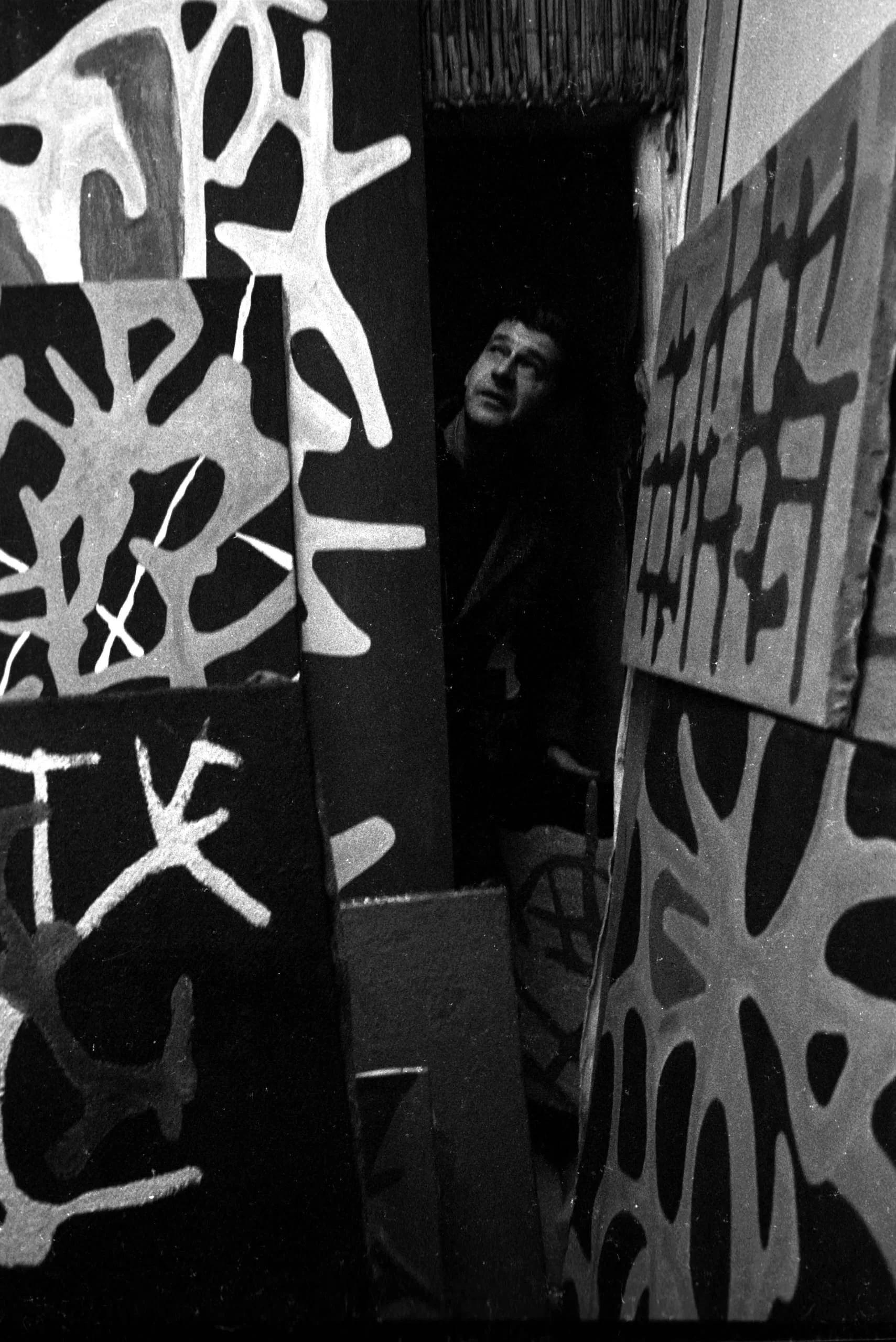 Black and white photograph of a man in a dark doorway, nearly hidden among large canvases painted with bold white organic branching patterns on black grounds