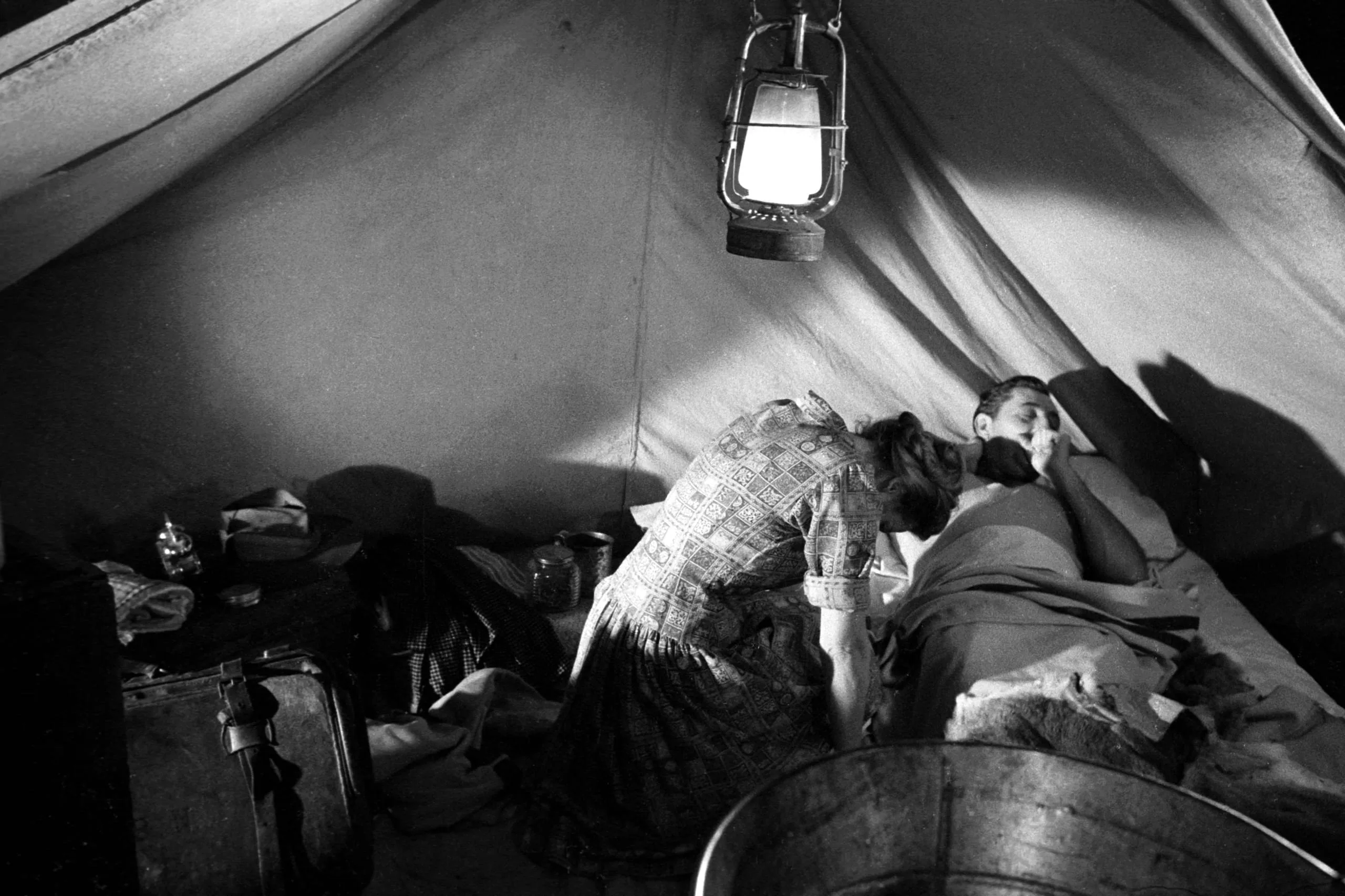 Black and white photograph inside a canvas tent, a woman leaning over a bearded man lying on a cot, lit by a hanging kerosene lantern