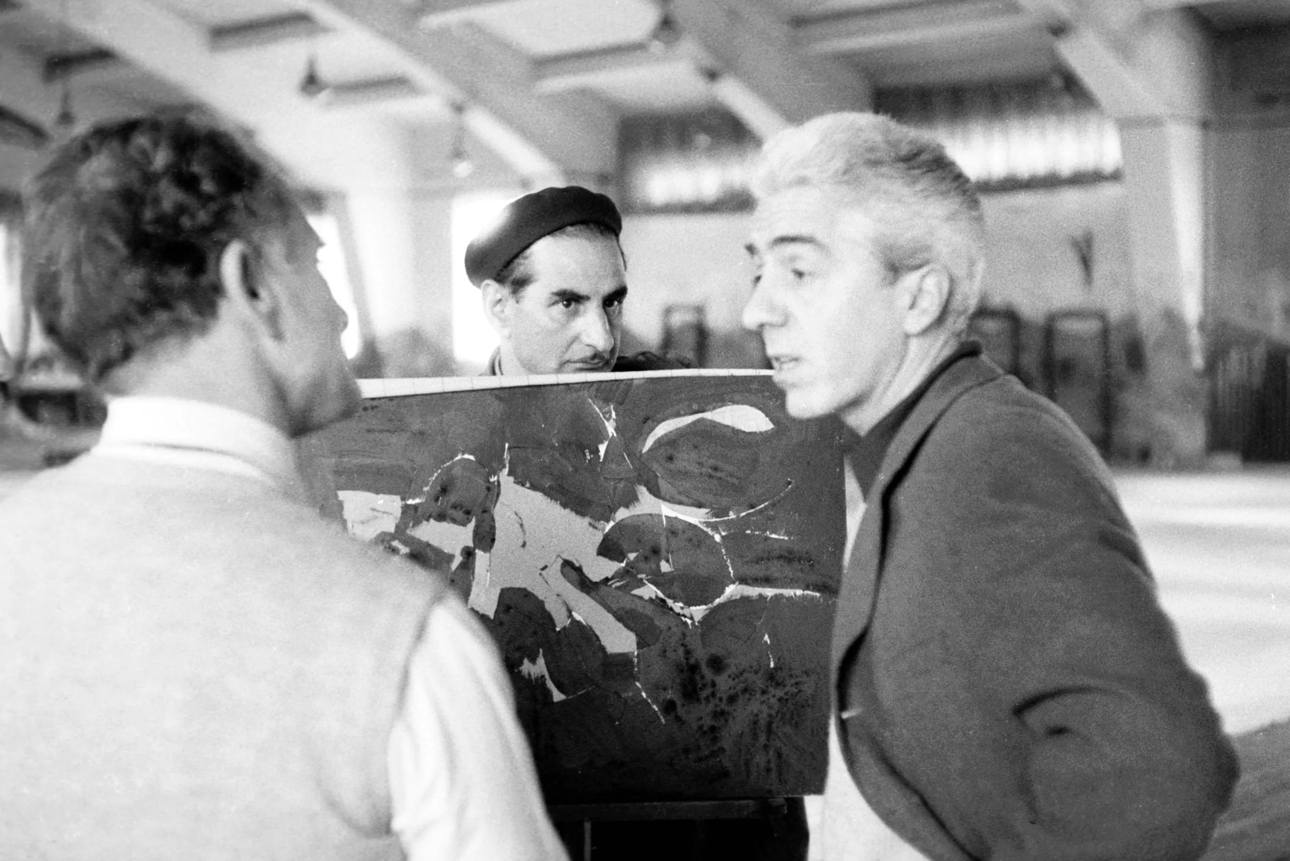 Black and white photograph of three men gathered around a large abstract painting with bold dark and light brushwork in a spacious interior