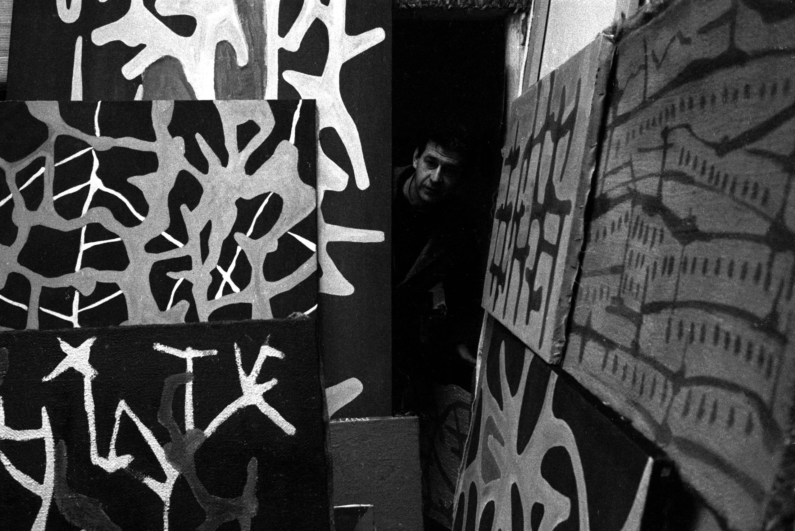 Black and white photograph of a man peering through a dark doorway, flanked by large canvases painted with bold, branching abstract forms