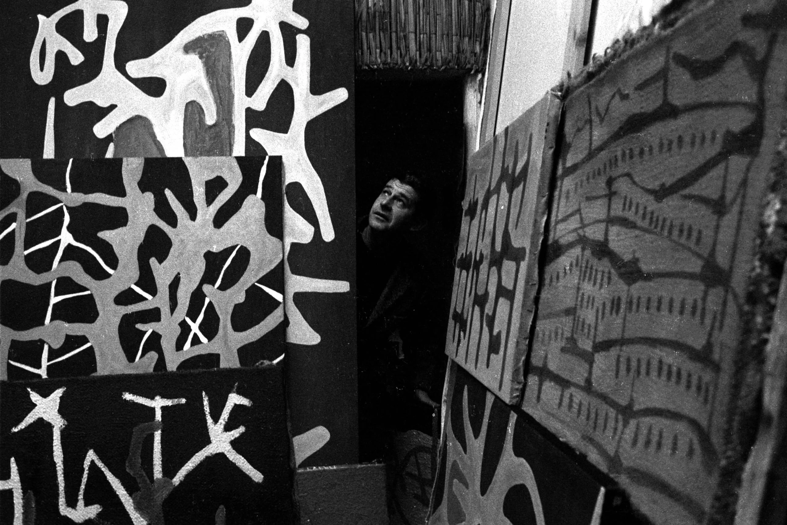 Black and white photograph of a man peering through a shadowed doorway, surrounded by large abstract paintings with bold white forms on dark grounds