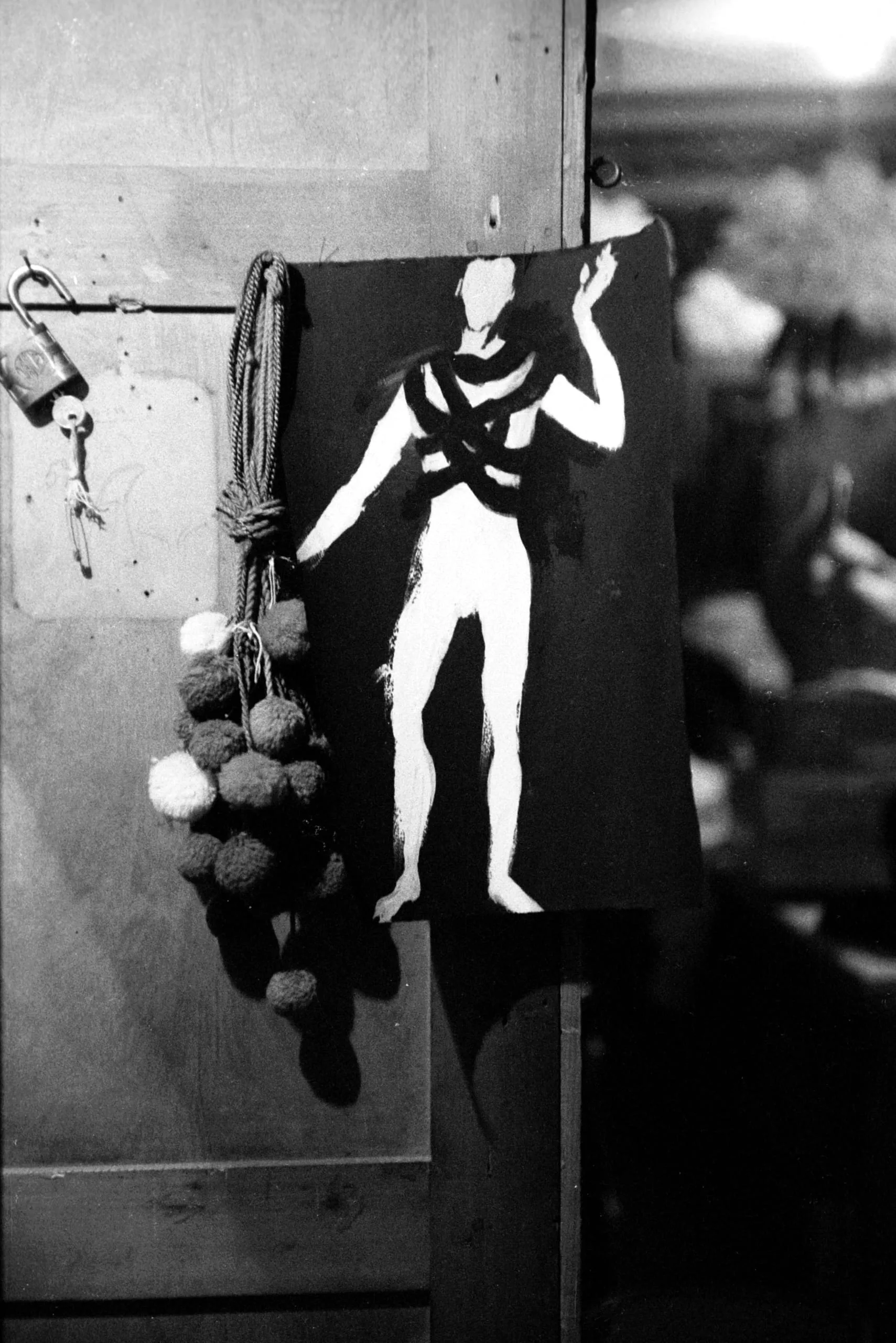 Black and white photograph of a wooden door with a painted paper figure pinned to it and a knotted rope hung with yarn pompoms