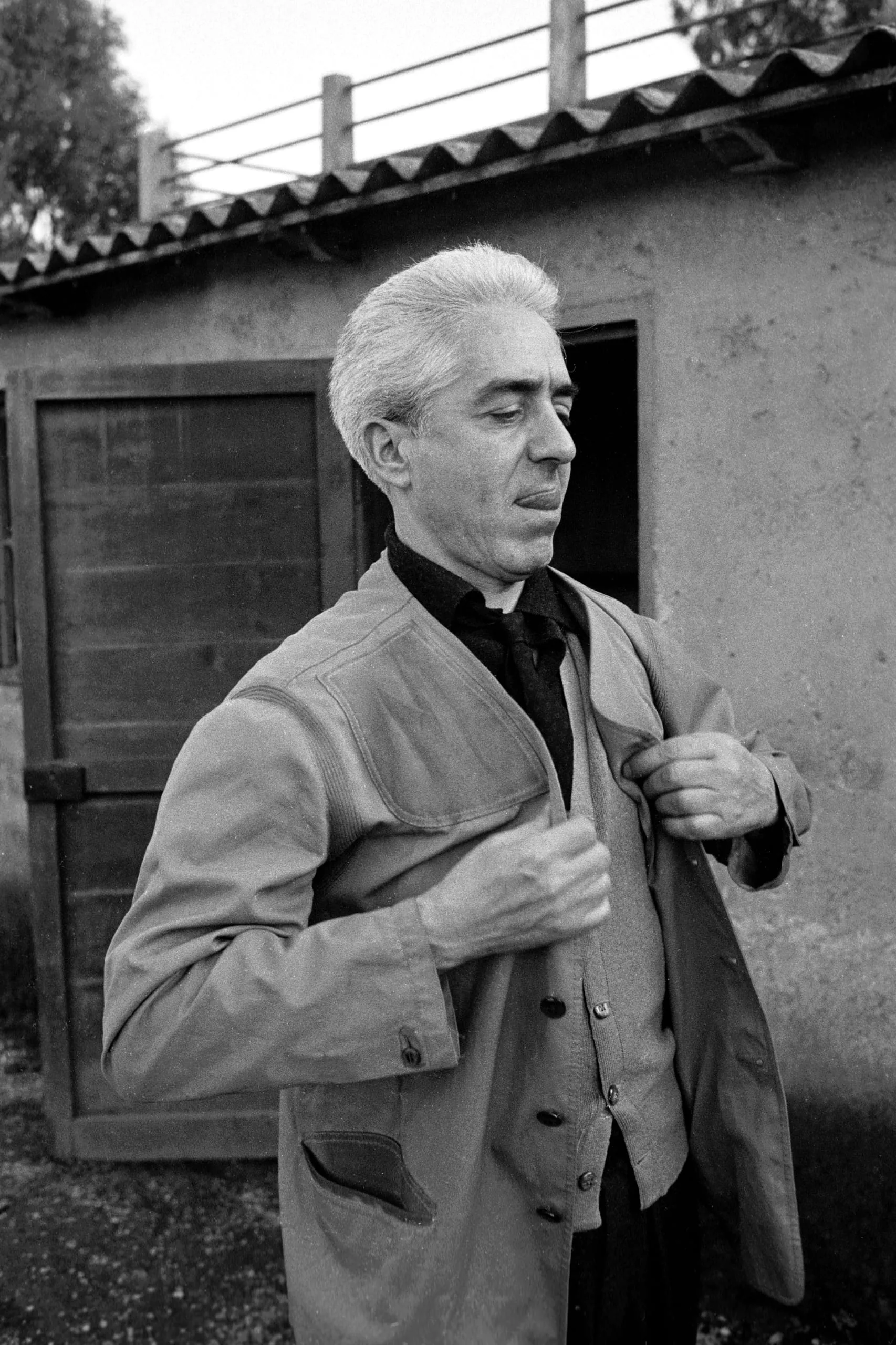 Black and white photograph of a white-haired man in a light jacket adjusting his clothing, standing before a concrete building with a wooden door