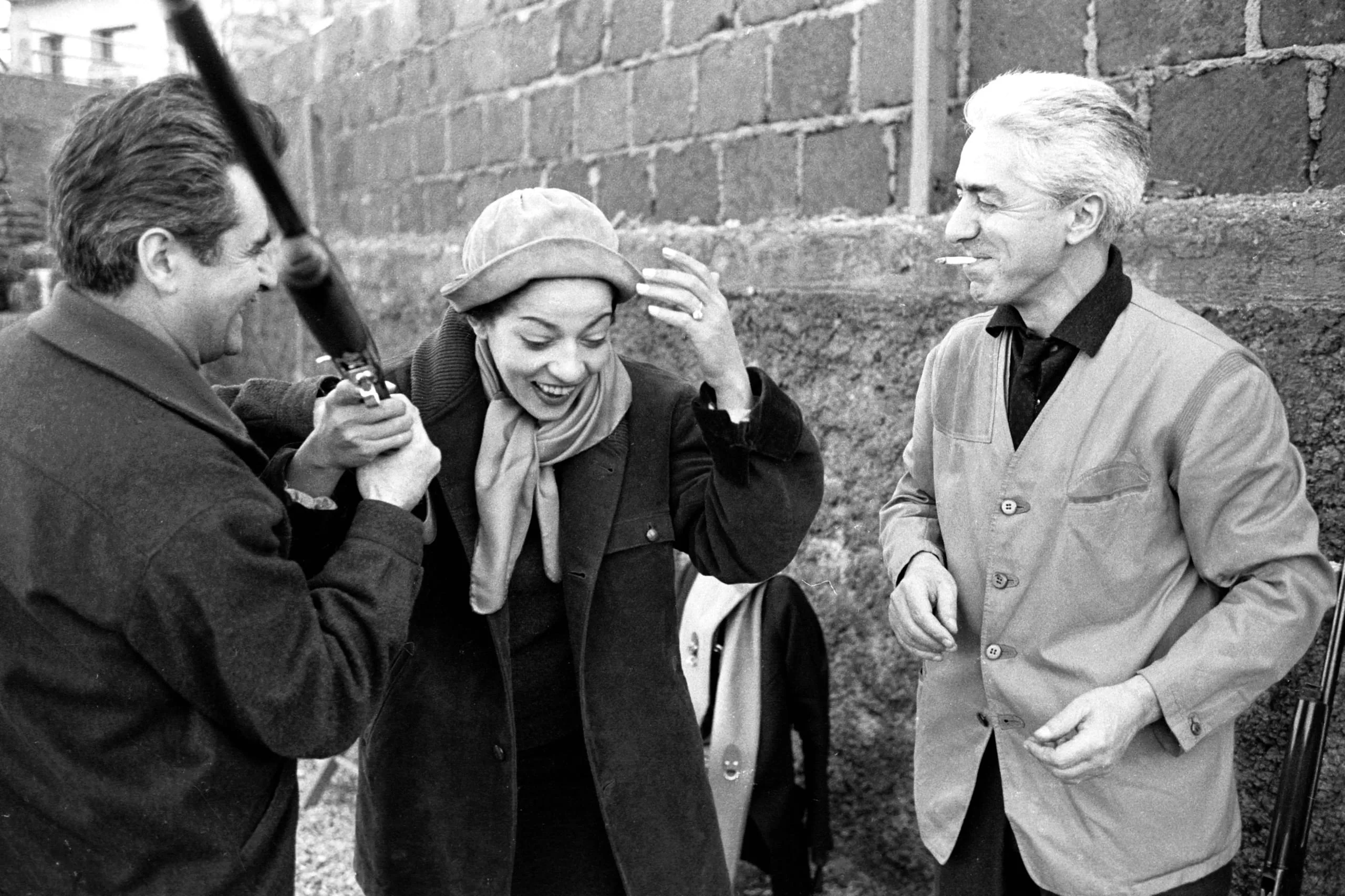 Black and white photograph of three adults laughing outdoors in front of a stone block wall, one holding film equipment