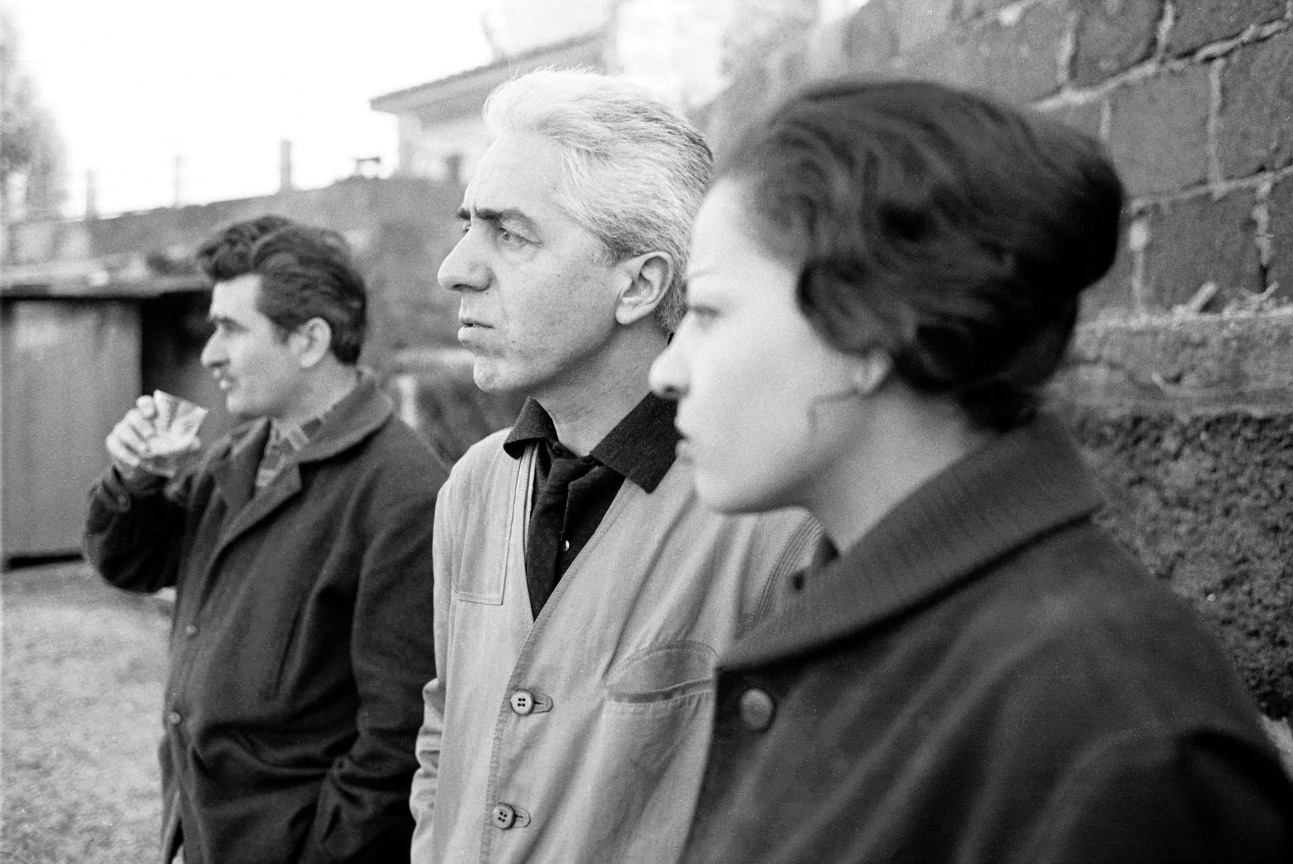 Black and white photograph of three people in profile facing right, standing before a brick wall outdoors