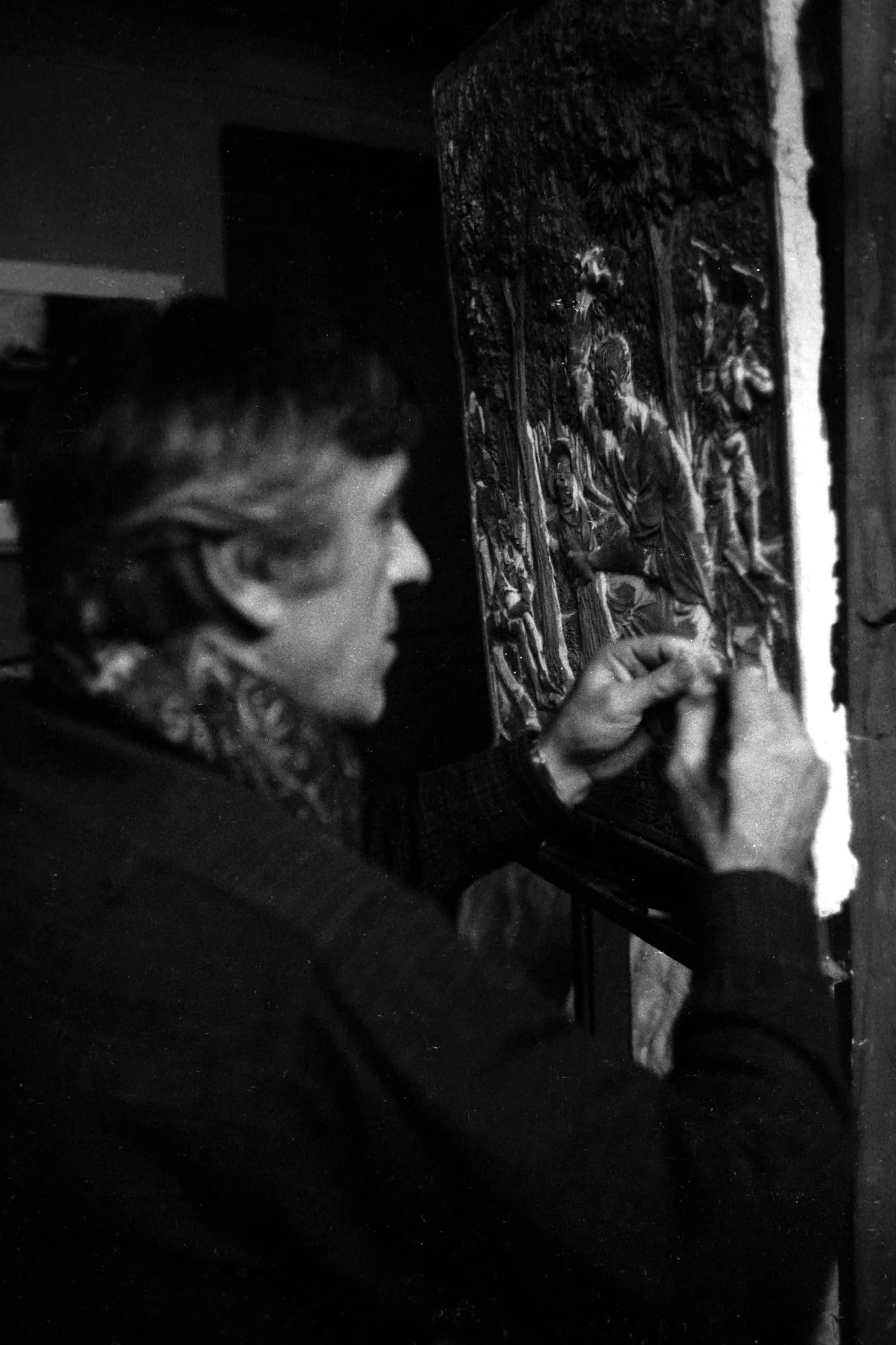 Black and white photograph of a man in profile working with both hands on a tall sculptural relief mounted on a stand, high-contrast studio lighting