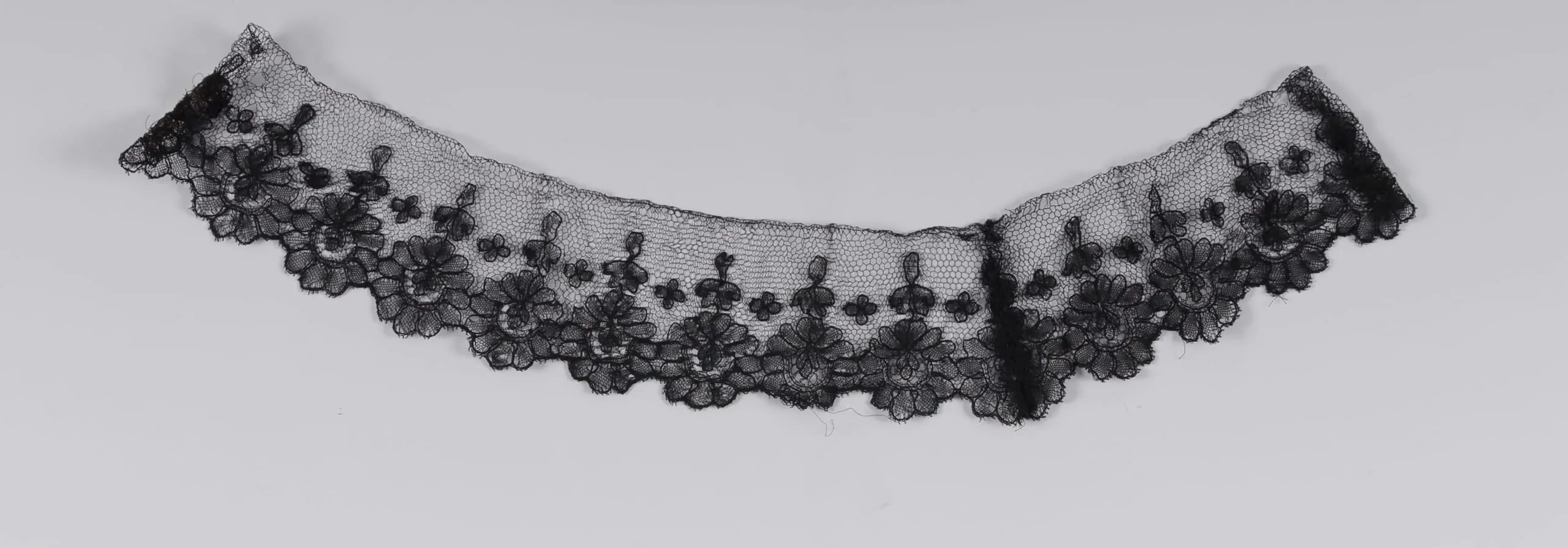 Black lace textile strip in a curved arc shape, with a scalloped floral border along the lower edge on an open net ground