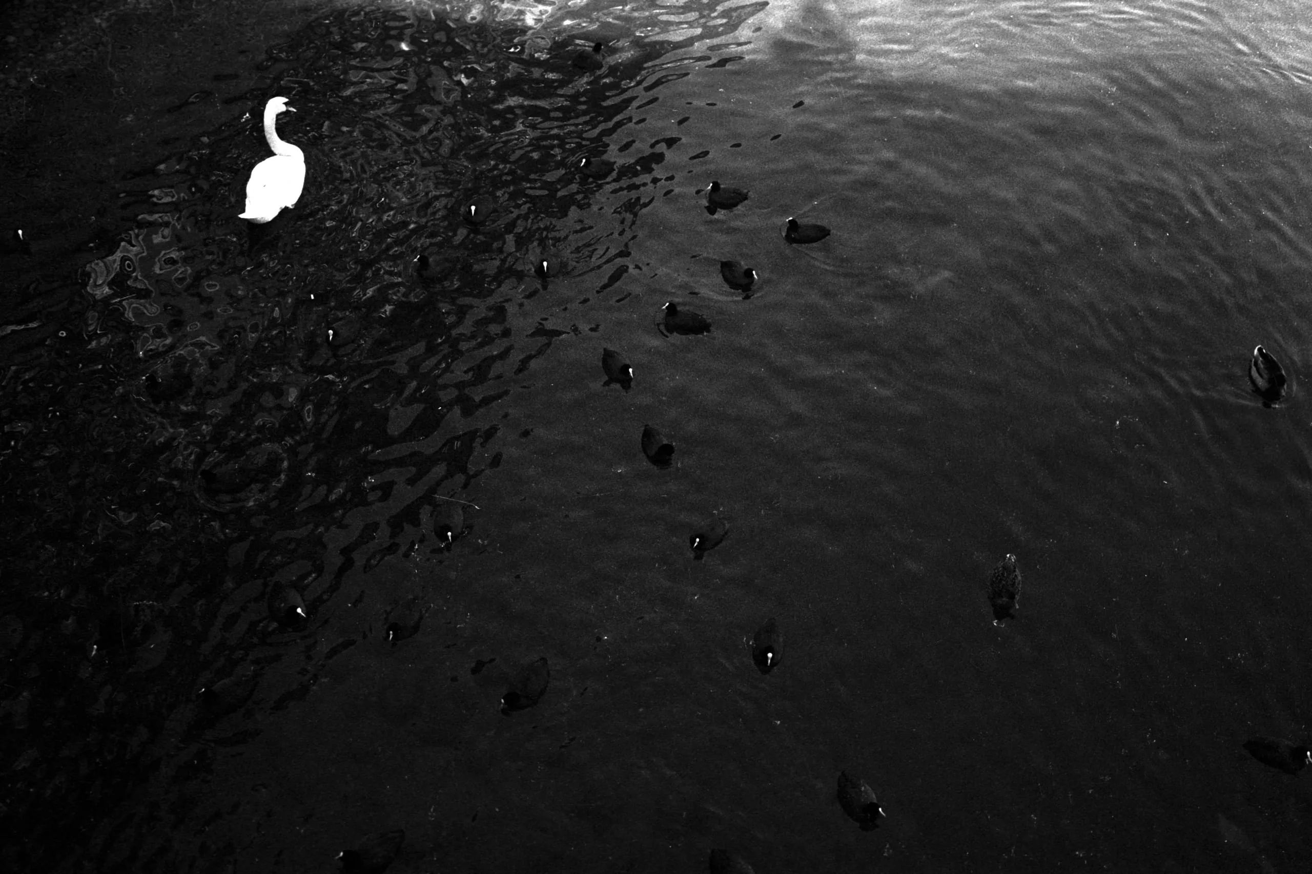 Black and white photograph looking down onto dark water, a bright white swan at upper left surrounded by roughly twenty dark birds scattered across the surface