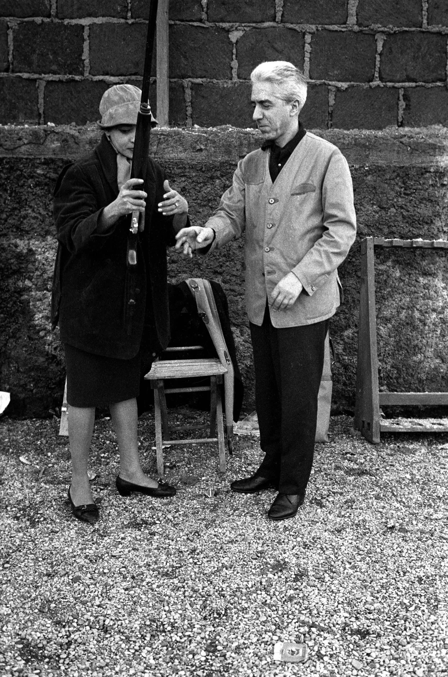Black and white photograph of a woman holding a long dark instrument and a man extending his open palm toward her, standing outdoors on gravel in front of a stone wall