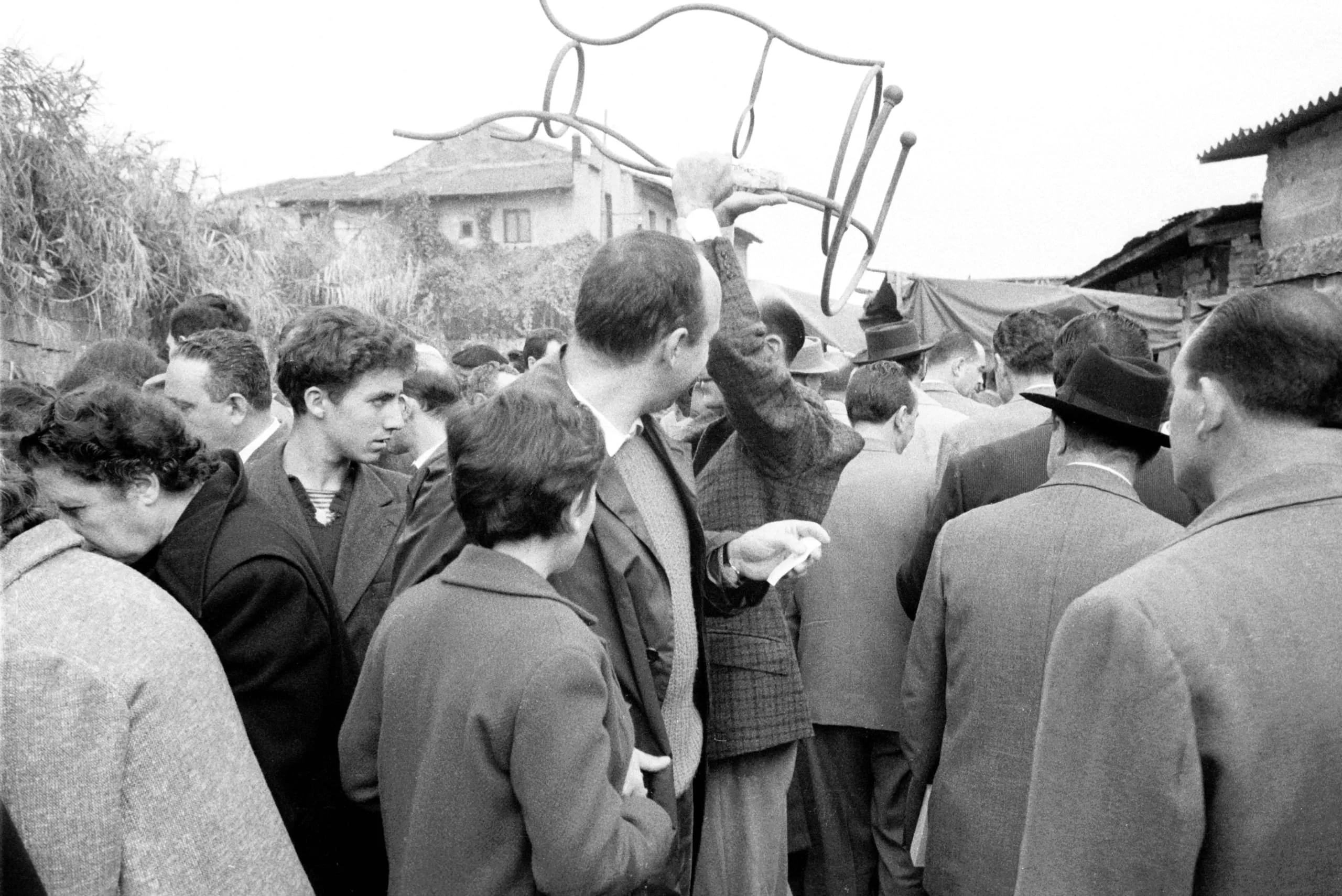 Black and white photograph of a dense outdoor crowd, one man raising a metal chair frame above his head, overcast light, mid-20th century dress